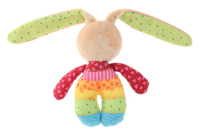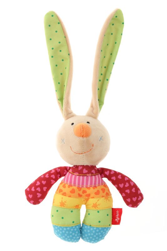 «Райдужний зайчик» - м’якеньке брязкальце від sigikid. Висота іграшки 15 см – ідеально для маленьких дитячих рученят. Іграшка вироблена із бавовни та поліестеру. Бавовняні частинки різних кольорів та фактур. Іграшка буде розвивати сприйняття кольору, слуху і тактильні відчуття. Для немовлят від народження.