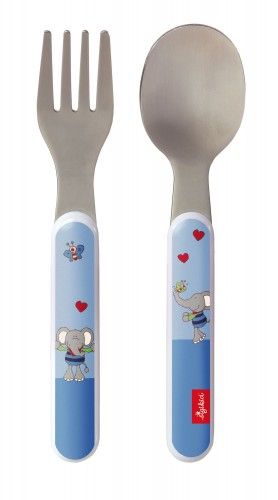 Набір дитячого столового приладдя «Lolo Lombardo» від німецького бренду sigikid. У блістерній упаковці - вилочка та ложечка із нержавіючої сталі із декоративними пластиковими вставками. На яскравому малюнку зображений милий слоник із метеликом та сердечками. Довжина кожного прибору – 14 см. Прибори легкі, безпечні, дитині буде зручно тримати їх у своїх маленьких ручках. У колекції «Lolo Lombardo» ще є: склянка, тарілочки, подушечка, ковдра, м’які розвивальні іграшки та комфортер – усіх їх об’єднує блакитна колірна гама та малюнок слоника із повітряною кулькою.