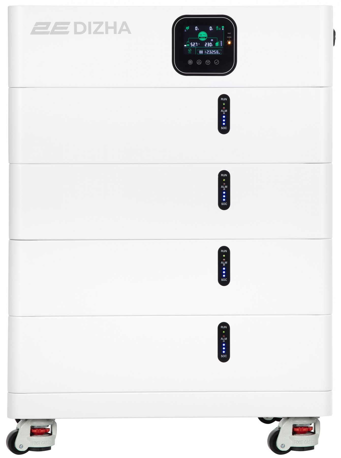 Ультра компактний дизайн робить PowerWall DIZHA уніфікованим рішенням для використання в квартирах, будинках та офісах, економлячи простір та зберігаючи естетичність дизайну, легке переміщення за допомогою коліщат. Система складається з: 2E-ESS-PSD10 х1; 2E-ESS-PSD10-B х1; 2E-ESS-EBD-5 х4.