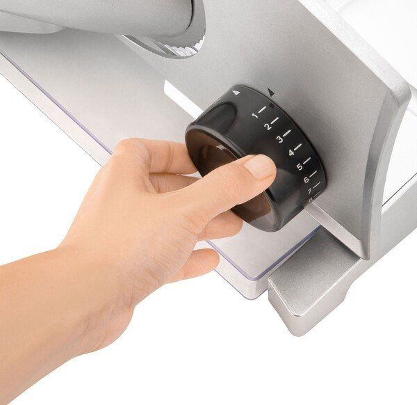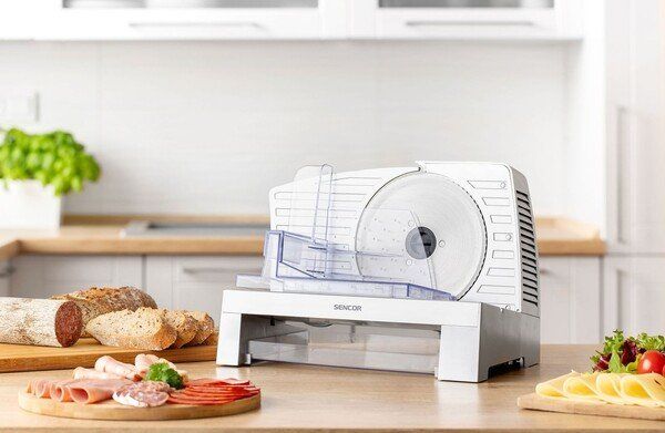 Електрична скибка Sencor SFS3050SL. Має знімні частини для легкого очищення та миття (візок для харчових продуктів, штовхач для харчових продуктів, відрізний диск). Товкач для харчових продуктів із затискними штифтами для запобігання ковзанню їжі під час нарізки. Можливість повністю висувати штовхач для харчових продуктів для нарізування великих продуктів