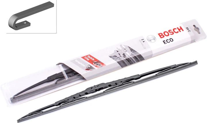 Склоочисник BOSCH Eco каркасний має довжину 500 мм і призначений для очищення лобового скла. Каркасна конструкція забезпечує надійний рівномірний притиск леза до поверхні. Виріб належить до серії ClassicWiper. Кріплення під гачок спрощує встановлення на сумісних автомобілях.