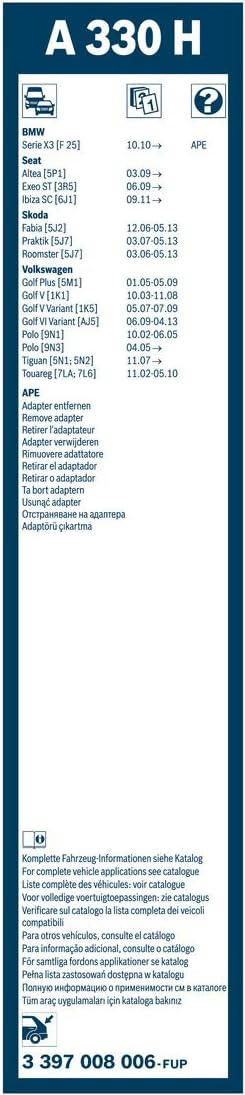 Склоочисник BOSCH Twin безкаркасний має довжину 330 мм і призначений для заднього скла автомобіля. Безкаркасна конструкція забезпечує рівномірний притиск по всій поверхні скла. Виріб належить до серії TWIN. Така форма зменшує опір повітря під час руху.