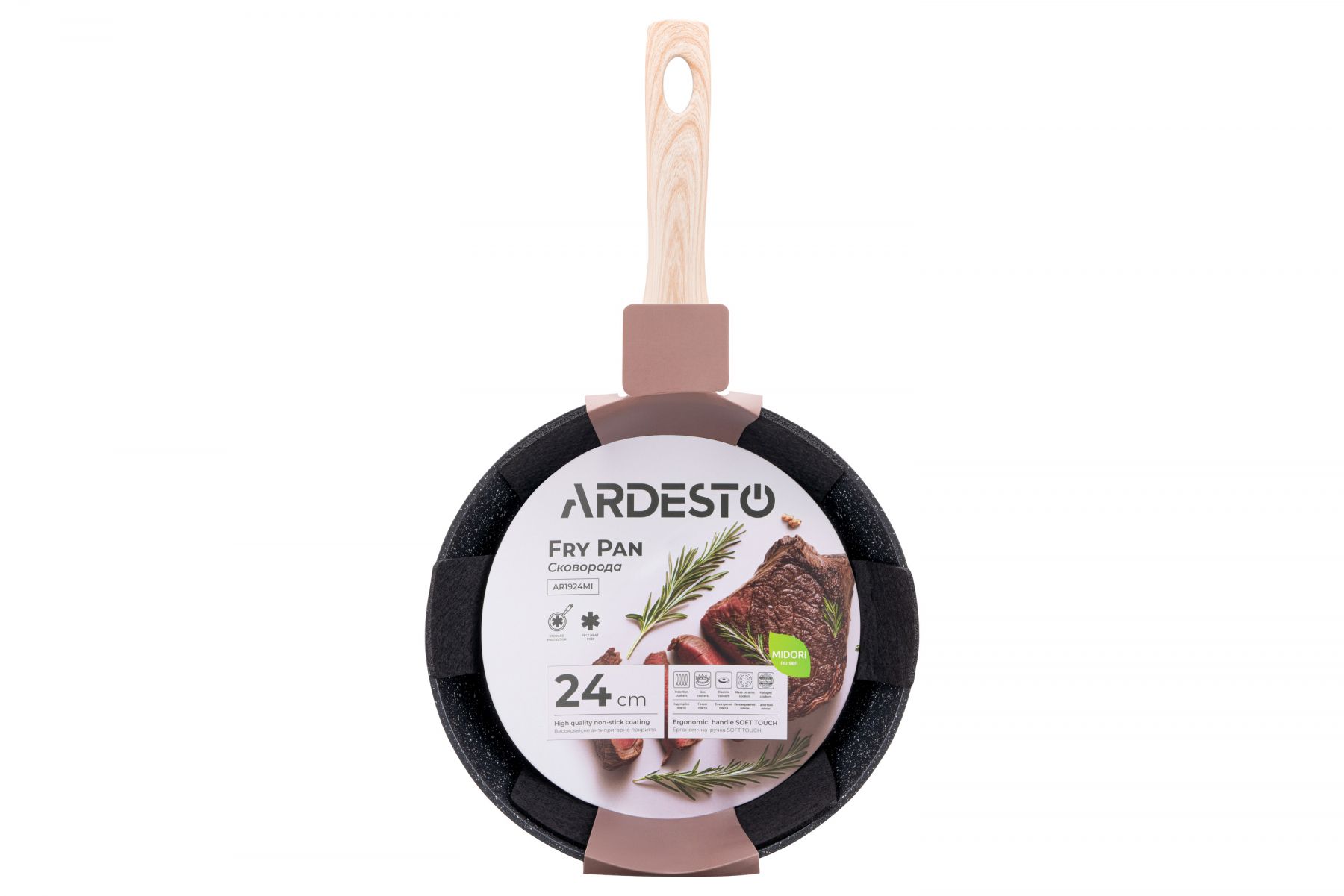 Сковорода ARDESTO Midori виготовлена з якісного алюмінію, завдяки чому забезпечується рівномірний розподіл тепла. Її діаметр становить 24 см за товщини стінок 2,3 мм. Сковорода має протипригарне мармурове покриття, що зумовлює можливість приготування страв із використанням мінімальної кількості олії.