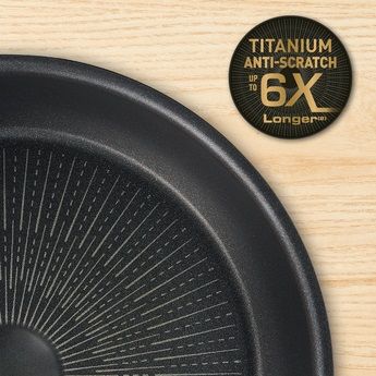Сковорода Tefal Unlimited ON, 28см, покриття Titanium Anti Scratch 6х, індукція, Thermo-Spot, алюм., чорний G25906AZ. Безпомилкове шипіння курки, кинутої на сковороду, брязкіт посуду, швидке ковзання лопатки в потрібний момент. Для екстремального приготування їжі необхідна сковорода, здатна витримати екстремальні умови. Сковорода Tefal Unlimited, поєднуючи в собі абсолютно нове покриття TITANIUM ANTI-SCRATCH, що забезпечує виняткову антипригарну стійкість, здатну витримувати навіть металеві прилади.