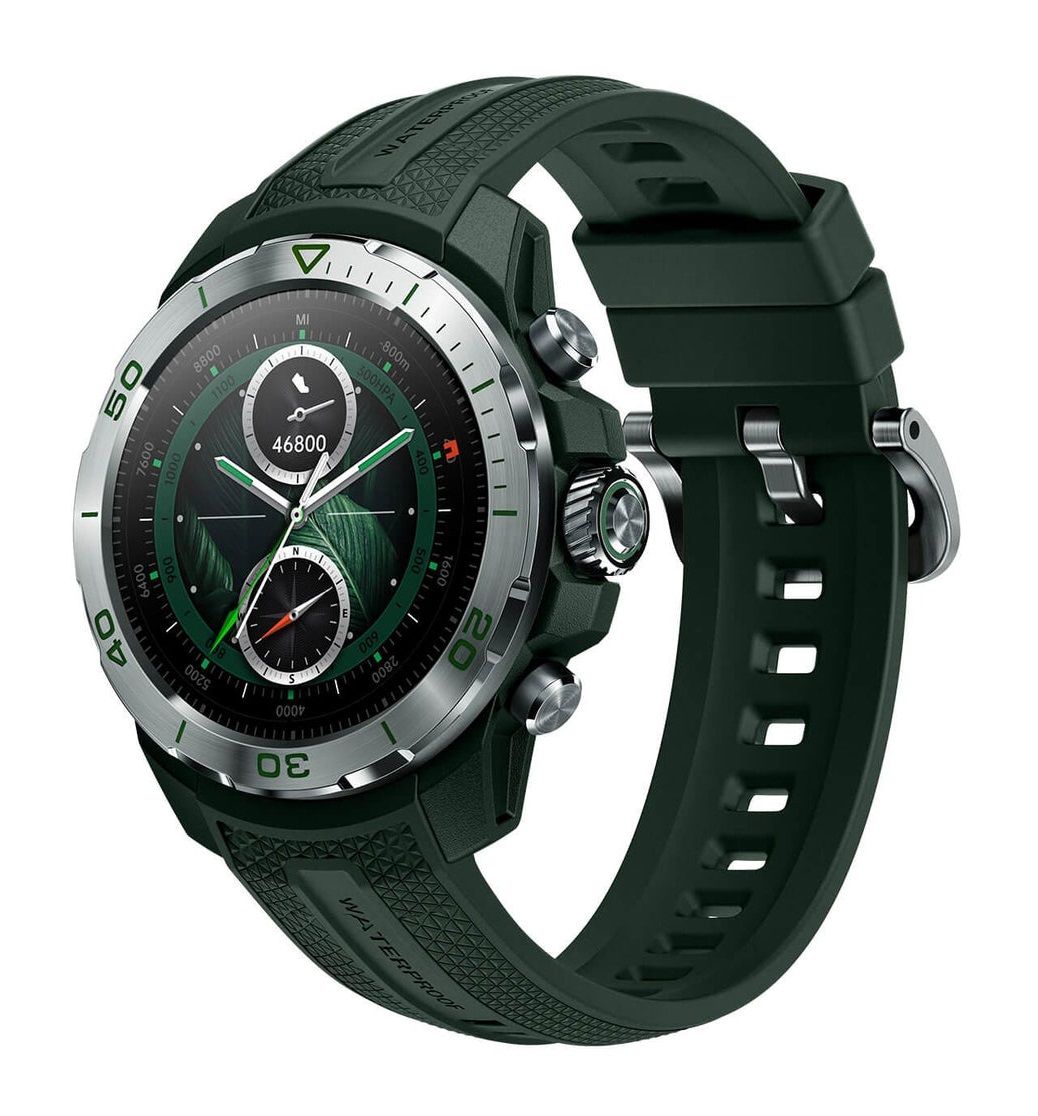 Смарт-годинник Mibro GS Explorer у насиченому зеленому кольорі має 1.32-дюймовий AMOLED-дисплей з яскравістю до 1500 ніт і роздільною здатністю 466×466 пікселів для чіткого зображення в будь-яких умовах. Корпус з нержавіючої сталі 316L, армованого полімеру та скла Corning Gorilla захищений за стандартом MIL-STD-810 і витримує занурення до 100 м завдяки 10 ATM. Двочастотний GPS, 150+ спортивних режимів з метриками плавання та алгоритмом SeekBeats, а також автономність до 20 днів у повсякденному використанні роблять модель придатною для інтенсивної активності.