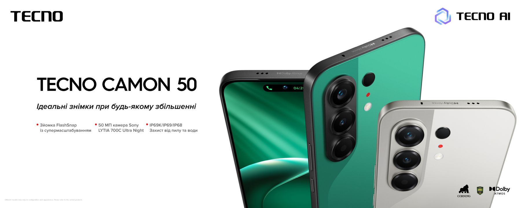Смартфон TECNO Camon 50 оснащений 6,78-дюймовим AMOLED-екраном з частотою оновлення 144 Гц та роздільною здатністю 2436×1080. Процесор Helio G200 Ultimate з 8 ядрами доповнюється 8 ГБ оперативної пам’яті та 256 ГБ вбудованого сховища. Подвійна основна камера 50 Мп (wide з OIS) + 8 Мп (ultrawide, 112°), фронтальна — 32 Мп, а батарея на 6500 мА·год забезпечує тривалу автономність. Корпус товщиною 7,53 мм і вагою 198 г доступний у кольорі Nebula Titanium.
