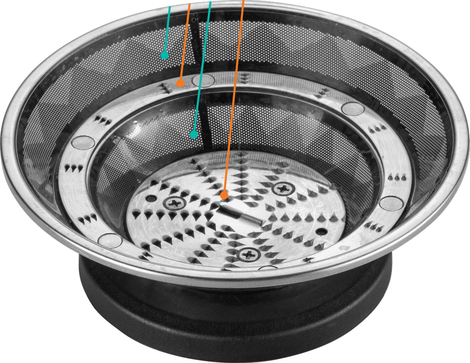 Особливості:мікрофільтр, гумові ніжки, Жолоб на ціле яблуко, легке очищення, захисний вимикач, захисна кришка, Зручний злив з носика з функцією проти крапель, Сітчатий фільтр, Ніжки-присоски проти ковзання, Пластикові защіпки, Завантажувальна трубка XXL