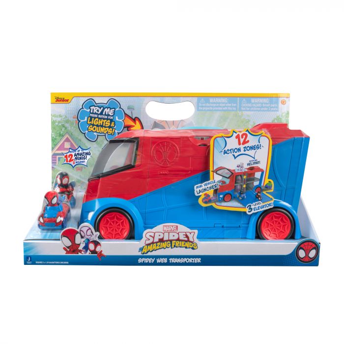 Spidey Web Transporter - транспортний засіб зі світлом та звуком! Цей дивовижний веб-транспортер має 12 зон дій, включаючи додатковий бонус у вигляді двох мініатюрних машинок, що йдуть у комплекті з транспортним засобом: Spidey та Miles Morales.