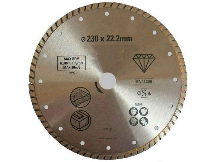 Диск відрізний алмазний універсальний 230x22.2 мм STANLEY STA38207 - призначений для чистого різання мармуру, стяжки, м'якого натурального і штучного каменю, глини, м'якої і середньої твердості вогнетривкої цегли, бетонних плит, цегли і т.і. Диск являє собою міцну, недорогу і універсальну модель з ріжучим кільцем Turbo, запобігає появі відколів на кромці різу. Крім того, унікальна форма диска забезпечує ефективне охолодження диска.