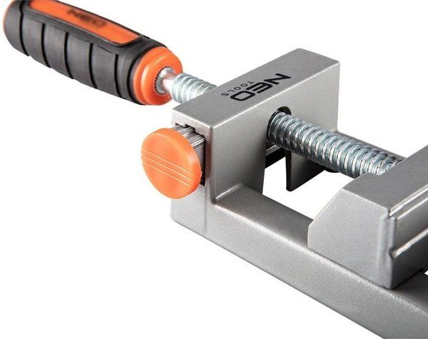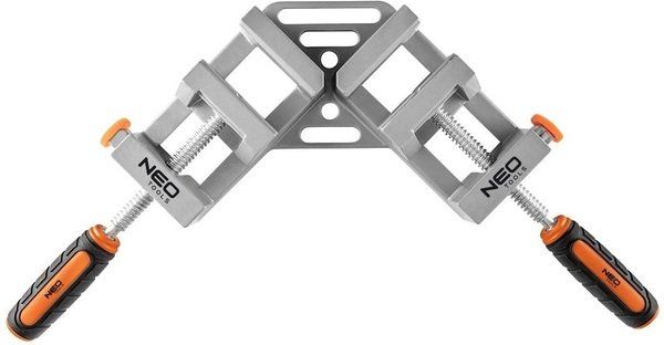 Струбцина Neo Tools, кутова, алюмінієва, дві напрямні 75 мм, 70х70мм 45-491. Струбцина кутова подвійна - це високоякісний столярний інструмент, що дозволяє з'єднувати дві дерев'яні деталі різної товщини (максимум до 65 мм) під кутом 90 градусів для полегшення подальшого збирання. Струбцина має губку з подвійним захопленням та можливістю регуляції обертання та кнопку, що дозволяє швидко прибрати затискач. Ідеально підходить для робіт склеювання, свердління, зварювання чи скручування.