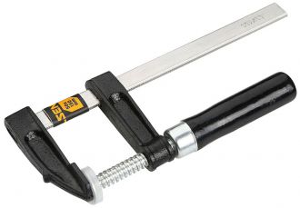 Струбцина Tolsen F-подібного типу глибиною 120 мм і шириною 300 мм призначена для фіксації деталей шляхом притискання між собою або до потрібної поверхні. Ручний інструмент широко використовується столярами і зварювальниками в процесі обробки.