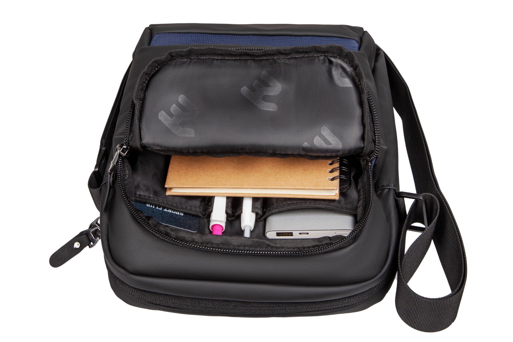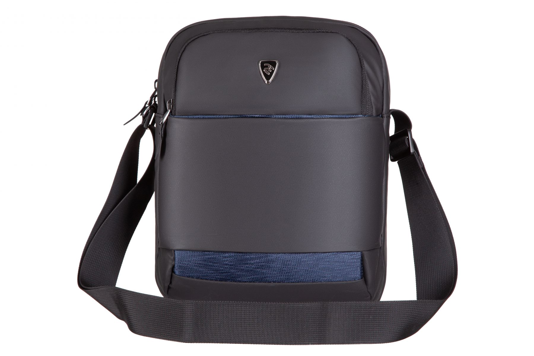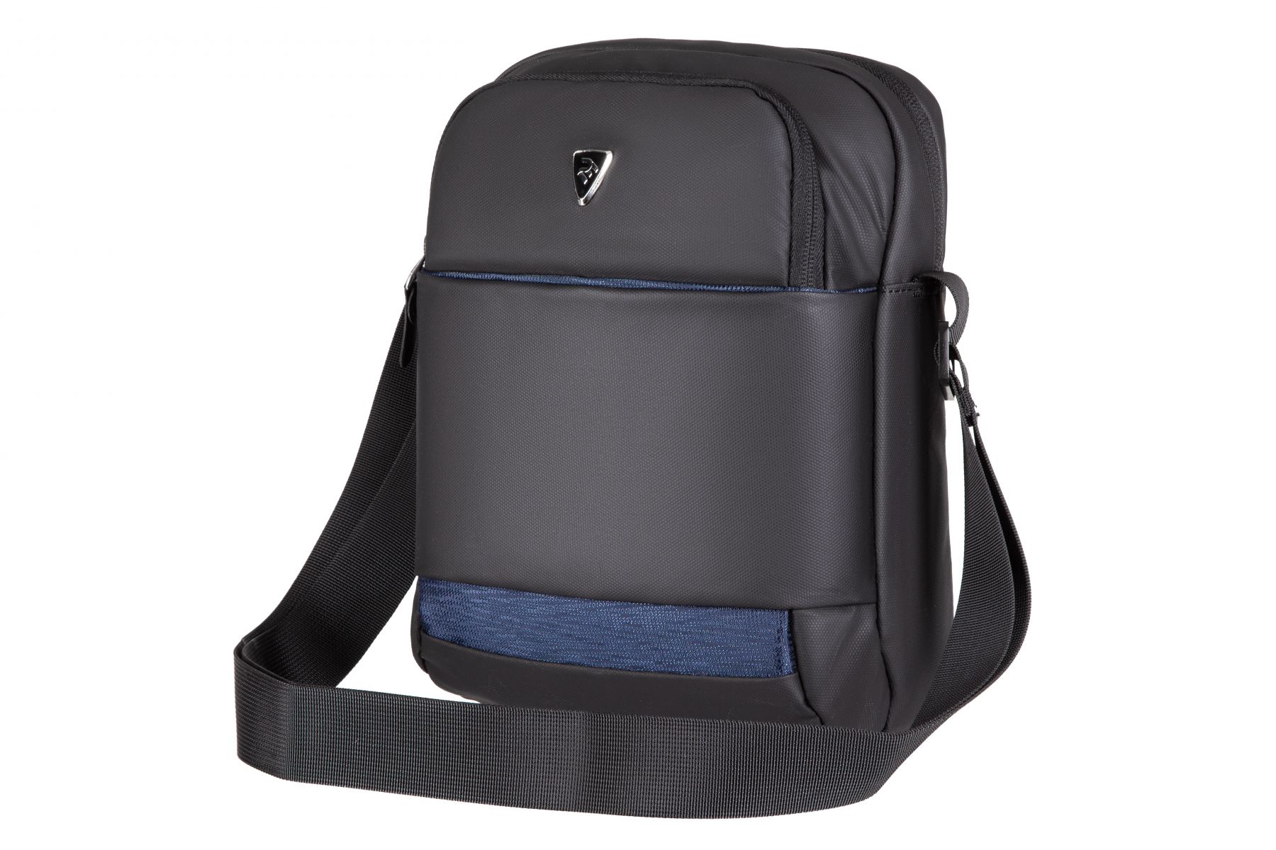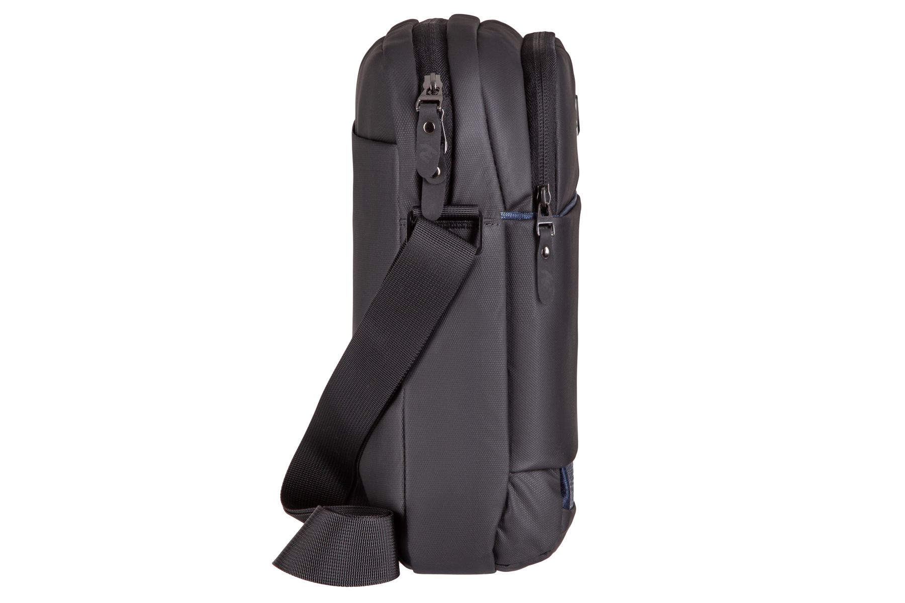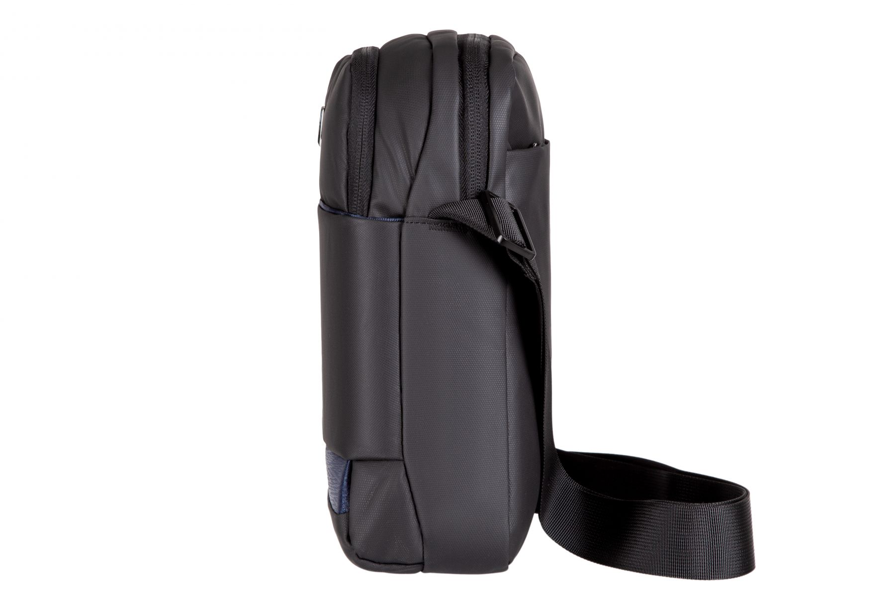 Компактна міська сумка призначена для щоденного використання. Виготовлена з поліуретану чорного кольору з декоративними елементами темно-синього кольору. Комплектується регульованим плечовим ременем.