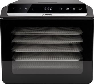 Сушарка для продуктів Gorenje FDK600DB із потужністю 580 Вт та 6 лотками діаметром 25 см забезпечує рівномірне висушування на всіх рівнях. Має LED-дисплей, електронне керування, регулювання часу від 0,5 до 48 годин та температури від 35 °C до 75 °C. Підходить для сушіння фруктів, овочів, м’яса, грибів, риби та домашнього печива.