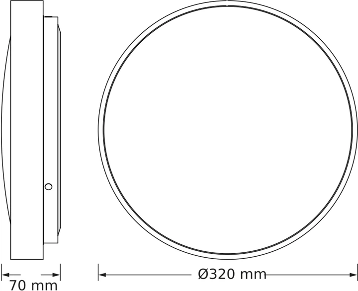 Світильник накладний OSRAM CEILING LUXO має круглу форму діаметром 32 см. Потужність становить 18 Вт, колір світіння — холодний 6500 K. Світловий потік досягає 1980 лм при куті розсіювання 120°. Основу виконано з металу чорного кольору, а плафон — з білого полімеру. Висота виробу 70 мм, вага 0,532 кг, термін служби 30 000 годин.
