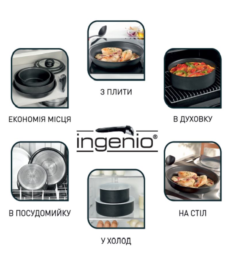 Завдяки 100% надійній знімній ручці, ви можете змінювати посуд Ingenio одним кліком - готуйте на плиті, запікайте в духовці, подавайте на стіл, зберігайте їжу в холодильнику. Ергономічний дизайн посуду дозволяє зручно зберігати його у кухонній шафі будь-якого розміру. Якісне, 100% безпечне антипригарне покриття TITANIUM FORCE прослужить удвічі довше*