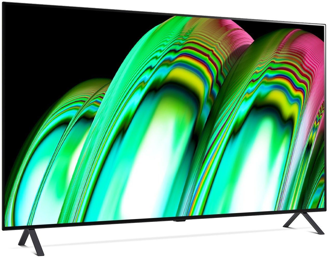 Абстрактний візерунок із зелених хвиль заповнює екран, а потім поступово зменшується, відкриваючи OLED-телевізор LG моделі A2. Екран стає чорним, а потім знову з'являється абстрактний візерунок з хвиль з текстом LG OLED нижче.