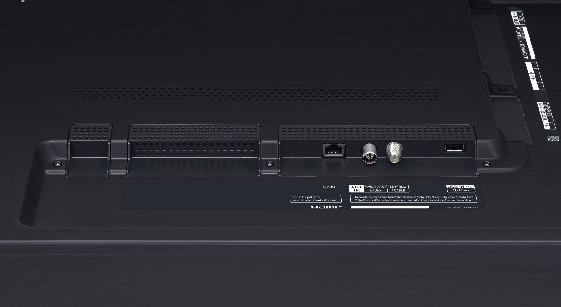 Входи:LAN, HDMI, USB, Вхід для антени RF, Simplink (HDMI CEC), eARC (HDMI 3)