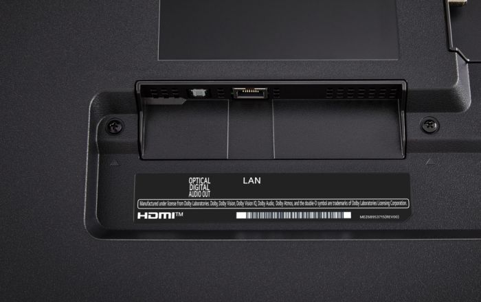 Входи:LAN, HDMI, USB, Вхід для антени RF, Simplink (HDMI CEC), eARC (HDMI 2)