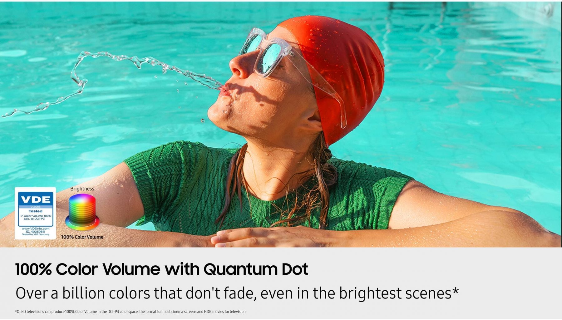 Технологія квантових точок дозволяє досягти неперевершеної якості зображення. Завдяки інноваційній технології, в основі якої лежить процес перетворення світла на колір, телевізор передає 100% колірного об'єму та забезпечує реалістичність зображення за будь-якого рівня яскравості.