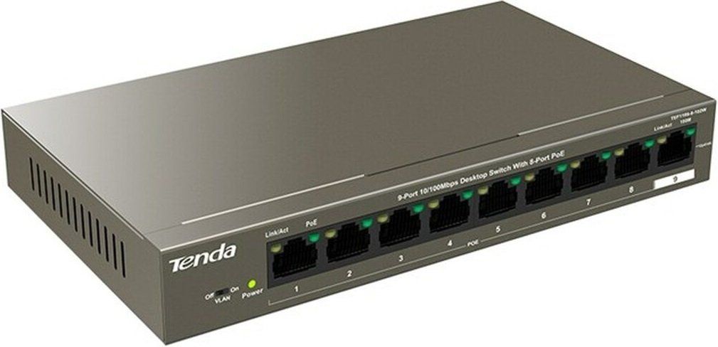 Комутатор TENDA TEF1109P-8-102W оснащений 9-ма портами 10/100 Мбіт/с. RJ45. Порти 1-8 підтримують стандарт IEEE802.3af (максимальна вихідна потужність PoE – 15,4 Вт) і стандарт 802,3at (максимальна вихідна потужність PoE: 30 Вт). Комутатор пропонує максимальну вихідну потужність PoE 92 Вт і забезпечує потужність для обміну даними з точками доступу, IP-камерами і IP-телефонами через кабелі CAT5e. Також оснащений такими режимами як Standard і VLAN. Таким чином, TEF1109P-8-102W є ідеальним рішенням для малих і середніх підприємств, готелів і офісів для здійснення HD-спостереження і розгортання бездротових мереж.