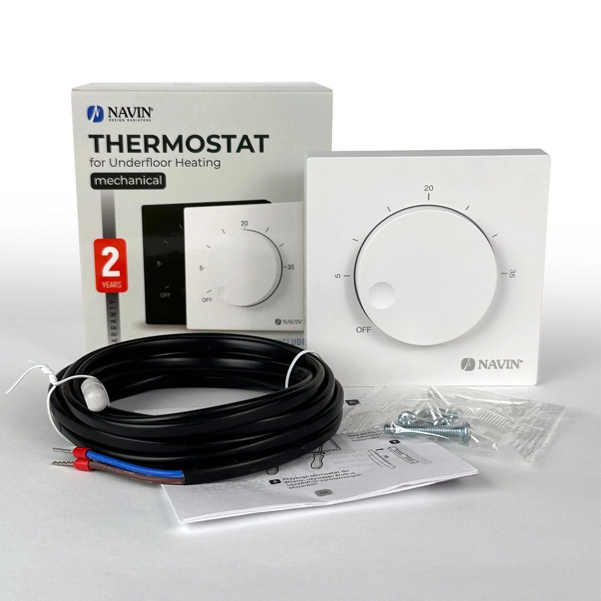 Додатково:LED-індикатор, обладнаний датчиком NTC для контролю температури підлоги, захист від перегріву, зручне керування за допомогою ручки, без програмування, два режими роботи (нагрів та охолодження), зручне керування поворотною ручкою, простий монтаж на стіну, світлодіодний індикатор роботи, режими “Обігрів / Охолодження” – перемикаються бічною кнопкою, захист при відсутності датчика