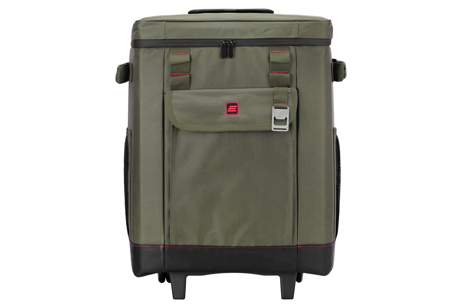 Термосумка на коліщатках темно-оливкового кольору з чорними вставками об’ємом 50 л. Призначена для збереження температури (холодної чи гарячої) напоїв і продуктів. Виготовлено з водовідштовхувального поліестеру. Передбачено телескопічну ручку та ручку на кришці. На лицьовому боці розміщено кишеню на липучці, а також відкривачку для пляшок. Усі карабіни, петлі та замки блискавок – металеві. Зручне та надійне рішення для транспортування. Розмір (ш×в×г): 38 x 49.5 x 27 см.