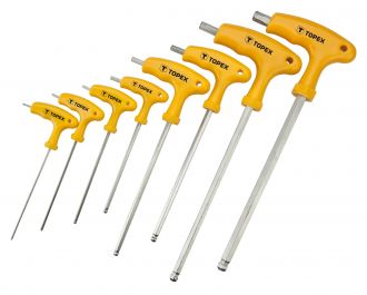 Шестигранні ключі Т-подібні TOPEX виготовлені з міцної хром-молібденової сталі, що забезпечує довгий термін служби інструменту. Кожен з восьми ключів, що входить до комплекту, має пластикову ручку ергономічної форми. Бренд TOPEX призначений для домашніх майстрів.