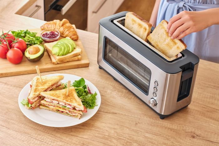 Функції:Розморожування, розігрів, Довгий отвір, підходить для підсмажування цілої скибочки хліба, Багаторазове нагрівання/розігрів, Автоматичне видалення випічки після завершення випічки/розморожування, Функції автоматичного центрування для рівномірного нагрівання товстих і тонких тостів, Скляне оглядове вікно