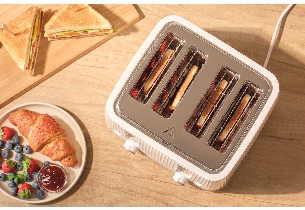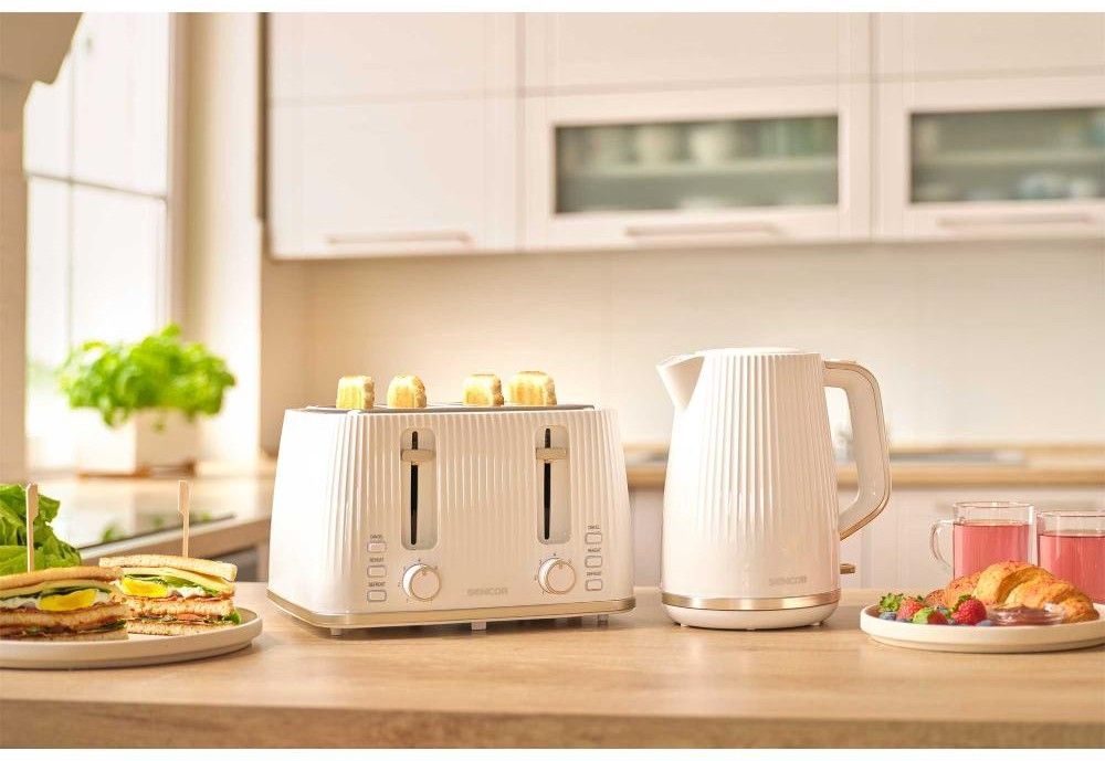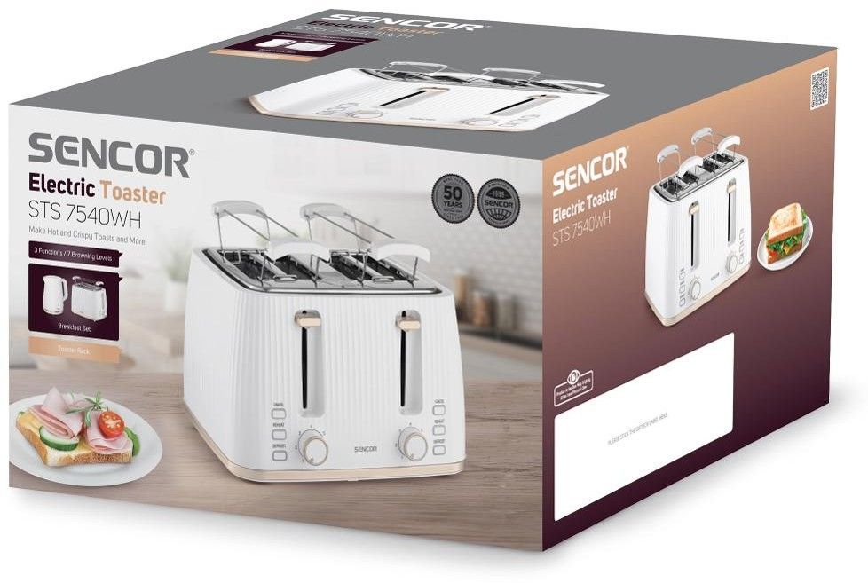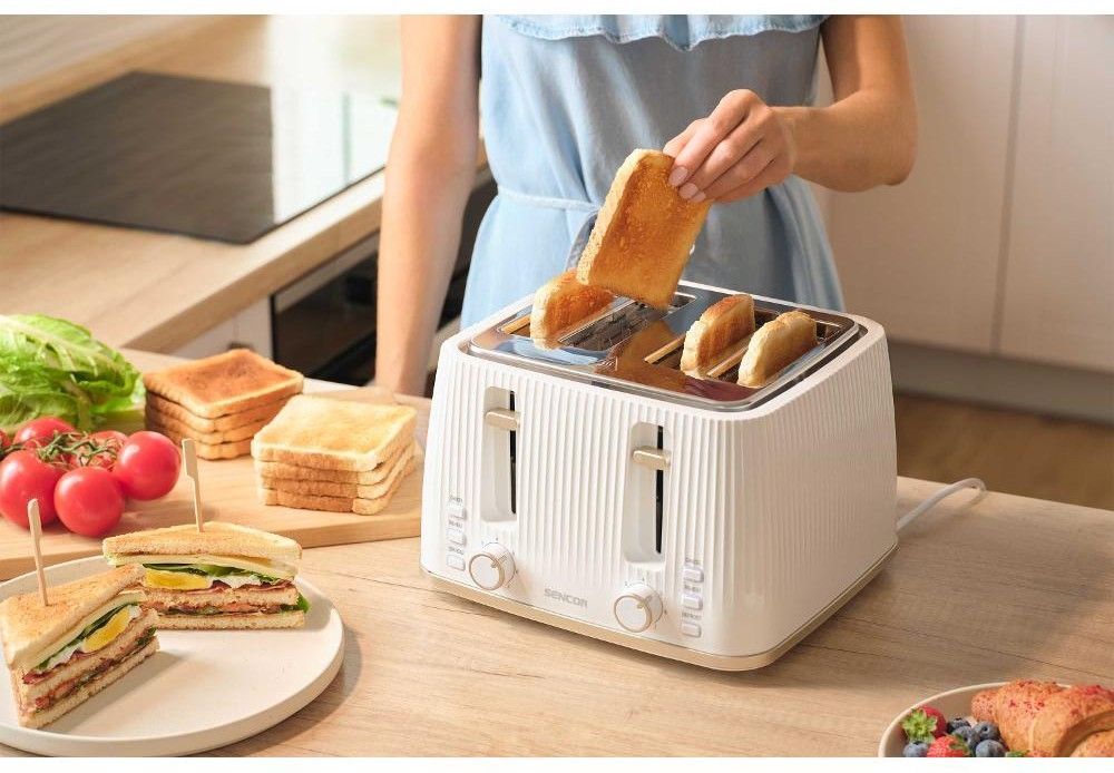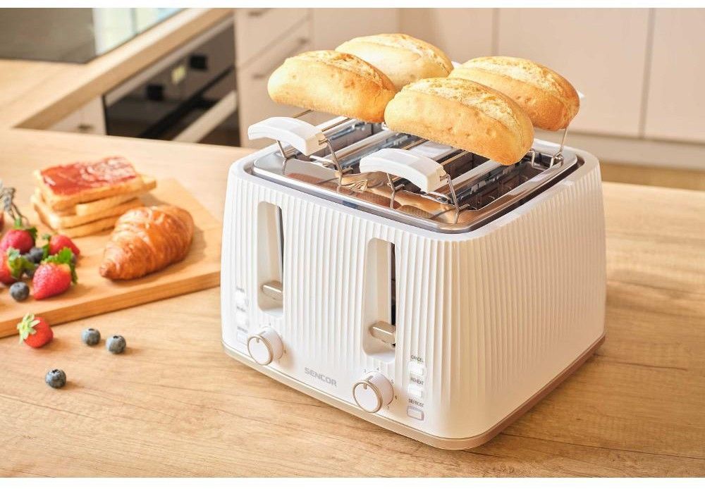 Sencor STS7540WH — потужний 4-слотовий тостер (1860 Вт) білого кольору з 7 рівнями підсмажування, функціями розморожування, підігріву та миттєвої зупинки. Знімна решітка для булочок, великий піддон для крихт і стильний світлий корпус. Ідеальний вибір для великої сім’ї або офісу — одночасно готує 4 тости.