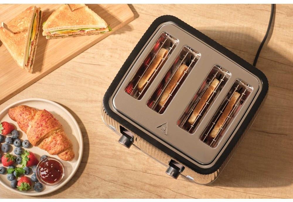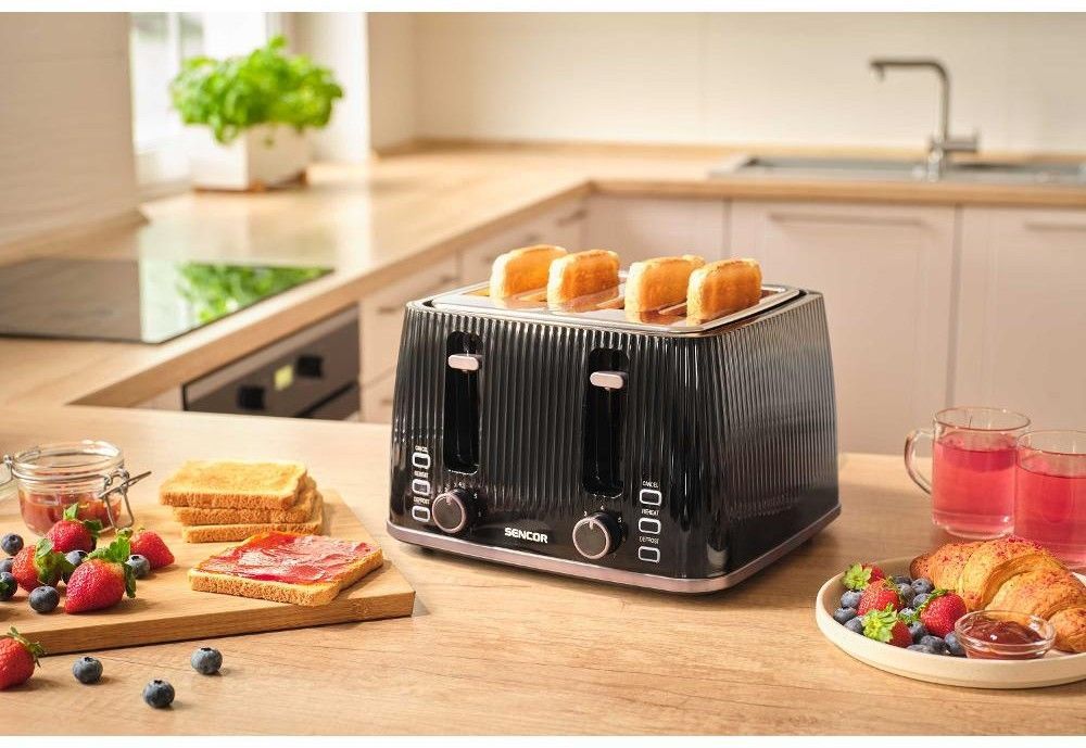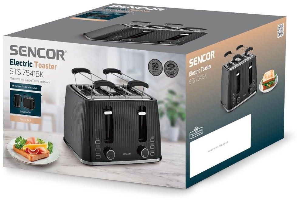 Sencor STS7541BK — потужний 4-слотовий тостер (1860 Вт) з 7 рівнями підсмажування, функціями розморожування, підігріву та миттєвої зупинки. Знімна решітка для булочок, великий піддон для крихт і стильний чорний корпус. Ідеальний для великої сім’ї або офісу — одночасно готує 4 тости.