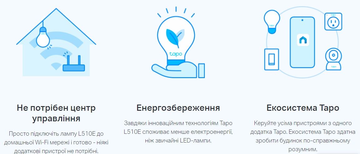 Tapo L510E Розумна Wi-Fi лампа, з можливістю затемнення. Затемнення — зручне регулювання яскравості для створення ідеальної домашньої атмосфери у будь-який час. Зручний функціонал — підібрали ідеальне освітлення для перегляду фільмів? Збережіть його на майбутнє. Розклад вмикання/вимикання на заданій яскравості у потрібний час. Включення на світанку та заході сонця — автоматична активація світла в залежності від часового поясу. Голосове керування — керуйте світлом голосовими командами за допомогою Amazon Alexa або Google Assistant. Дистанційне управління — віддалене управління світлом з телефону через додаток Tapo. Режим «Не вдома» — створення видимості присутності в будинку людей для відлякування непроханих гостей.