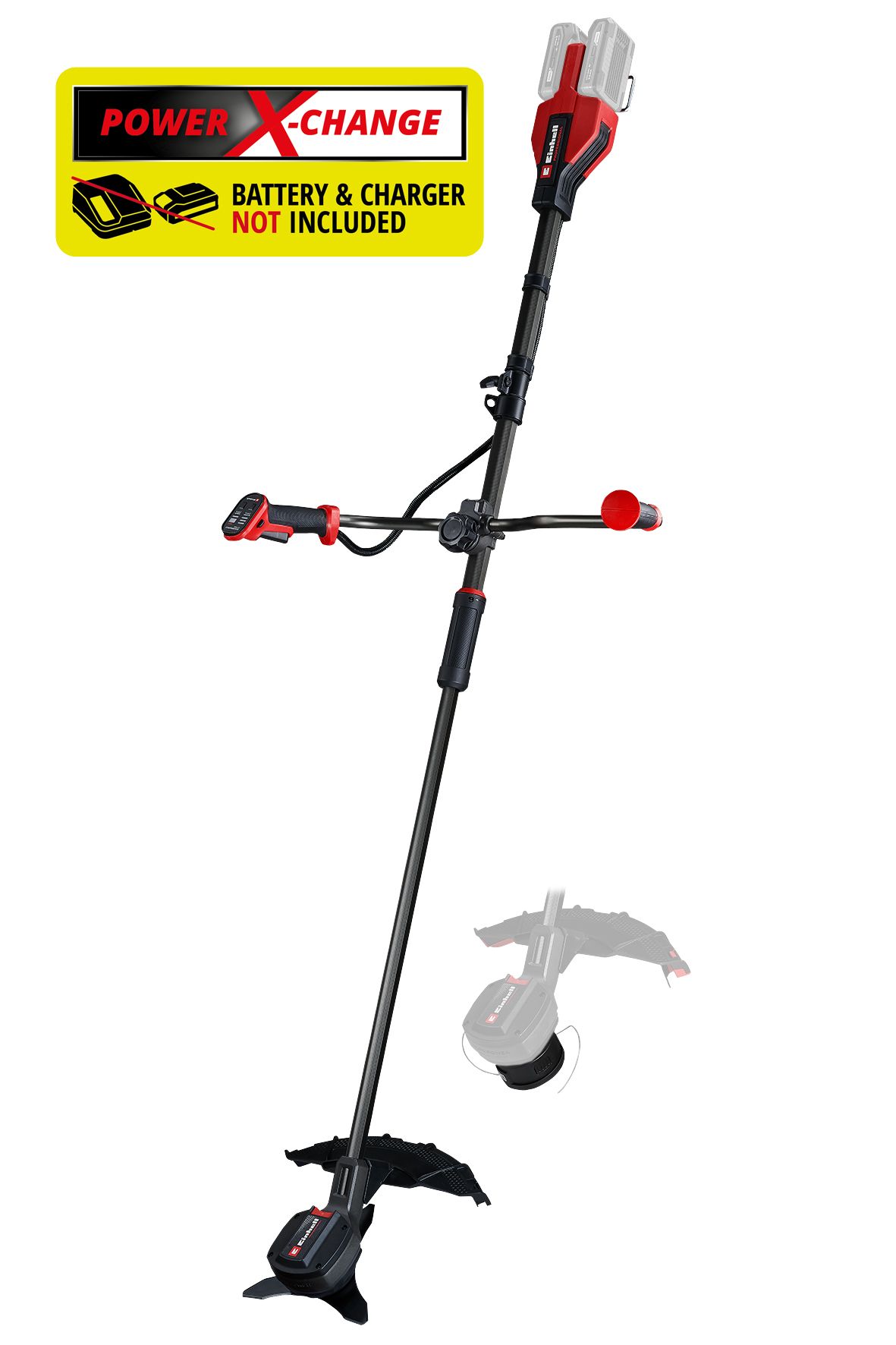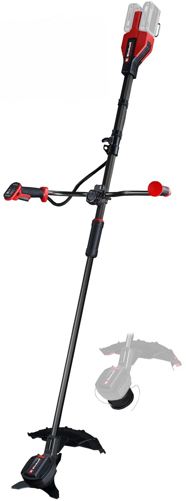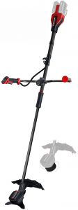 Акумуляторна коса Einhell Professional GP-BC 36/430 Li BL - Solo — 36 В (Power X-Change 2×18 В), безщіткова, для високої трави, кущів і заростей. У комплекті: шпуля 43 см (автоподача) та 3-зубий ніж 25,5 см; швидка заміна завдяки блокуванню шпинделя. Велосипедна рукоятка, 2-ступенева електронна швидкість і індикатор заряду на рукоятці; дводільний кожух, ударозахист АКБ сталевою рамою, роздільний вал і настінне кріплення.
