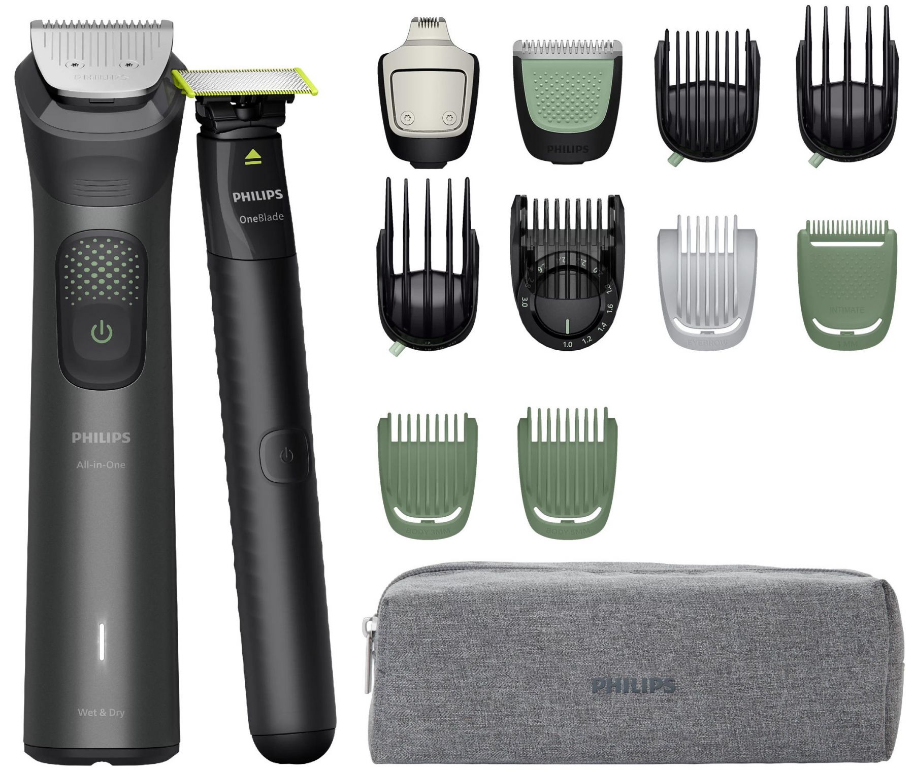 Тример Philips Series 9000, для обличчя, голови, тіла, акум., насадок-15, OneBlade в компл., сталь, сірий