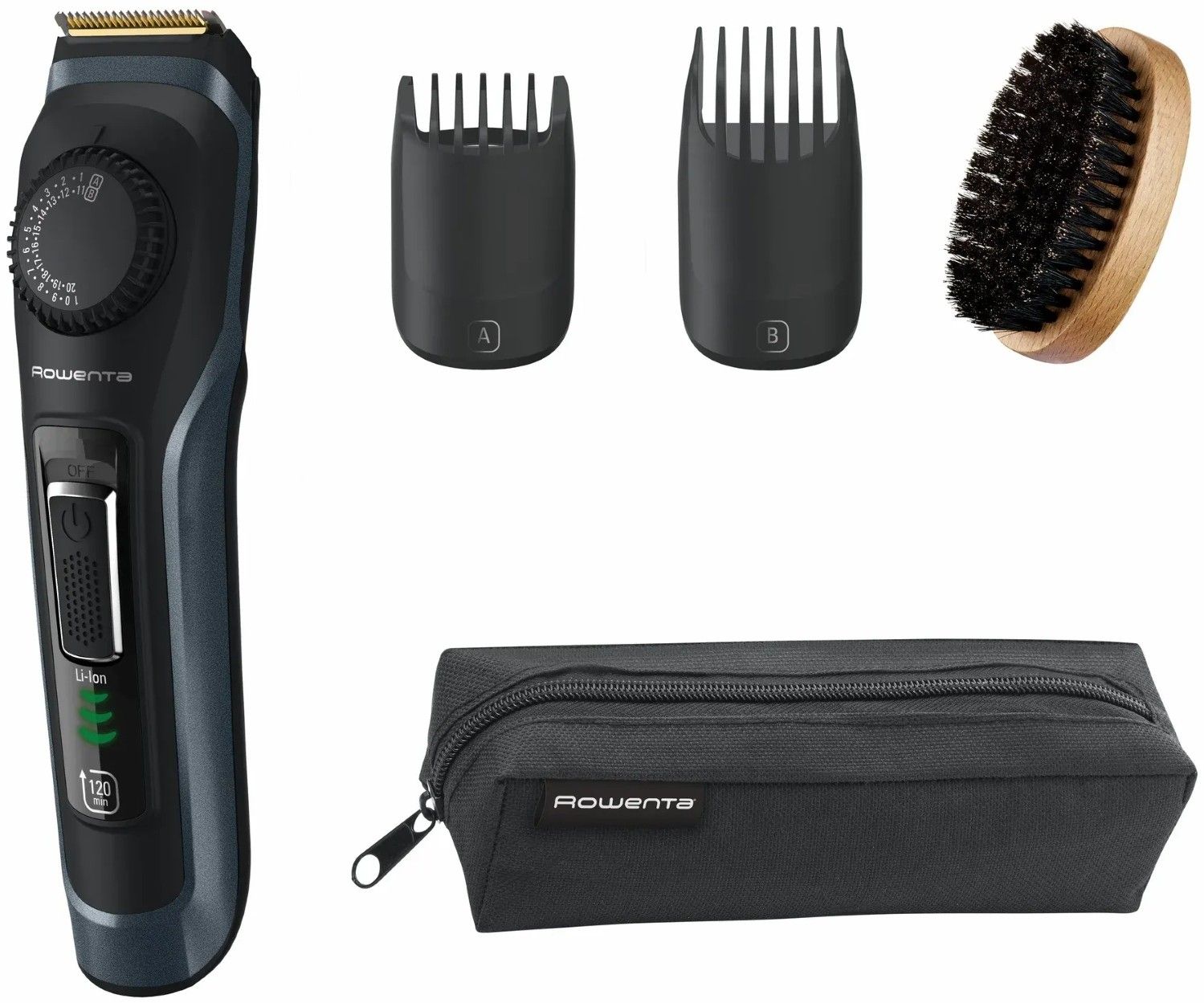 Тример Rowenta Virtuo, для бороди і вусів, мережа+акум., насадок-2, чохол, титан.напил., кейс для зберігання, чорно-синій
