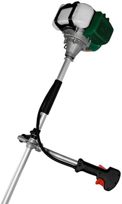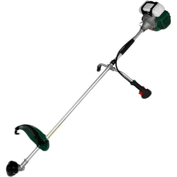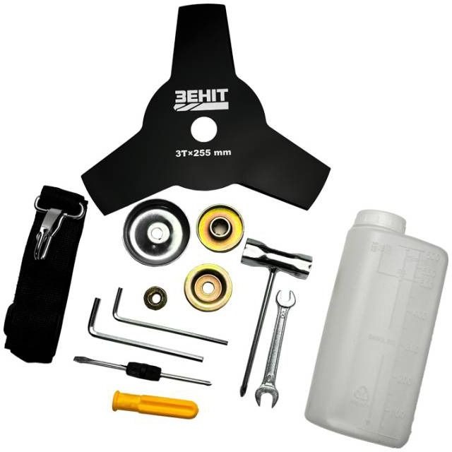 Комплектація:інструкція, Гарантійний талон, наплічний ремінь, пакування, додаток, комплект інструменту для складання/регулювання, Ємність для паливної суміші, Редуктор ріжучого блоку, Ріжучий ніж з трьома лезами, ріжуча головка з жилкою, штанга з валом, права частина рукояті, ліва частина рукояті, комплект кріплення рукояті, основний захисний кожух, комплект гвинтів кріплення захисного кожуха