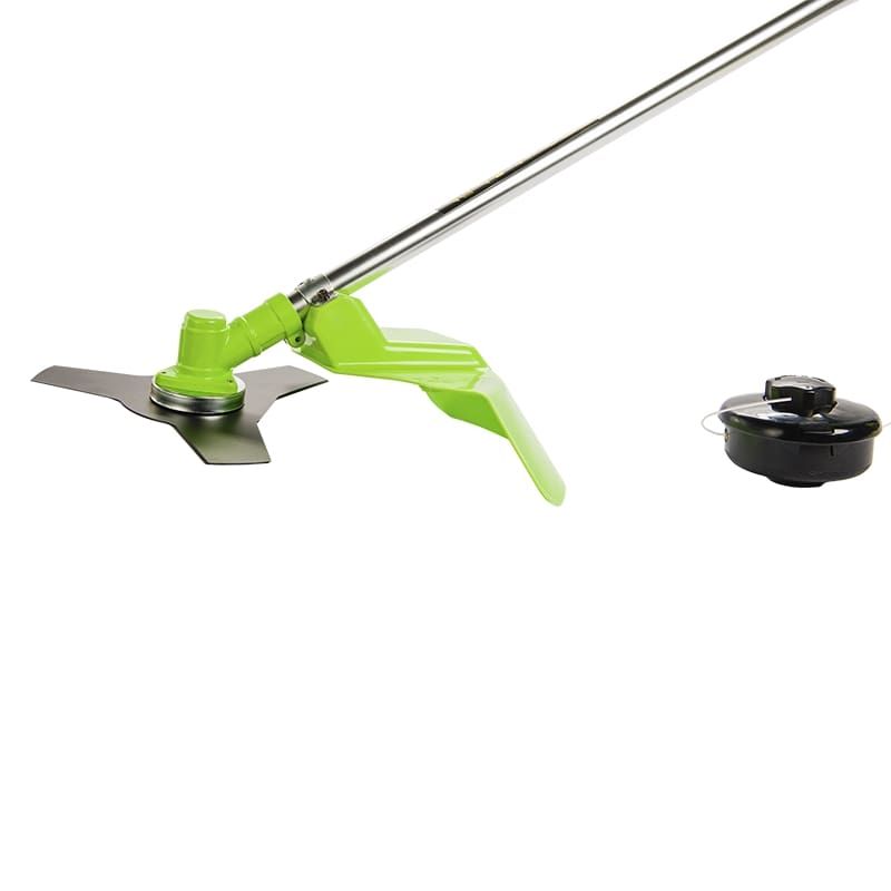 Комплектація:документація, захисний кожух, упаковка, передня рукоятка, набір ключів, наплічний ремінь, тример садовий, Набір фіксуючих елементів, Ріжучий ніж з трьома лезами, Ріжуча котушка з жилкою
