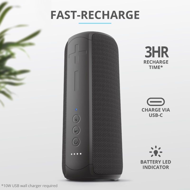 Потужна і міцна Bluetooth®-колонка ідеально підійде для подорожей і прогулянок. Стильна надійна конструкція з міцного матеріалу в прогумованому корпусі. Потужний насичений стереозвук не залишить нікого байдужим. Щоб збільшити потужність, зв'яжіть дві колонки по бездротовому каналу. Захист від води (IPX7); можна використовувати у басейну або на пляжі. До 12 годин відтворення без дозарядки. Швидка підзарядка колонки всього за 3 години (потрібно зарядний USB-пристрій потужністю 10 Вт). Кілька варіантів відтворення музики: через Bluetooth, карту micro SD і аудіороз'єм AUX. Вбудований мікрофон дозволяє здійснювати дзвінки.