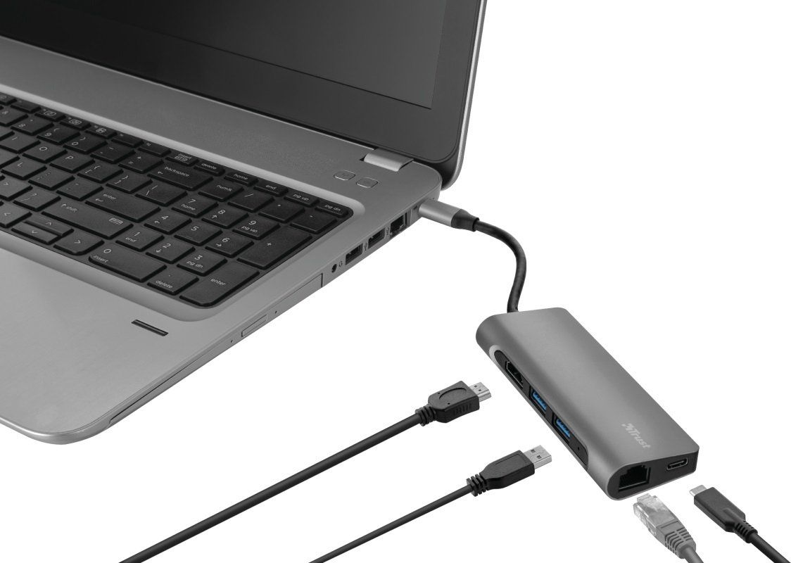 Стильний алюмінієвий багатопортовий адаптер додає ноутбуку порти HDMI, USB-C, USB, зчитувач карток пам'яті та мережевий порт, а для підключення використовує один порт USB-C