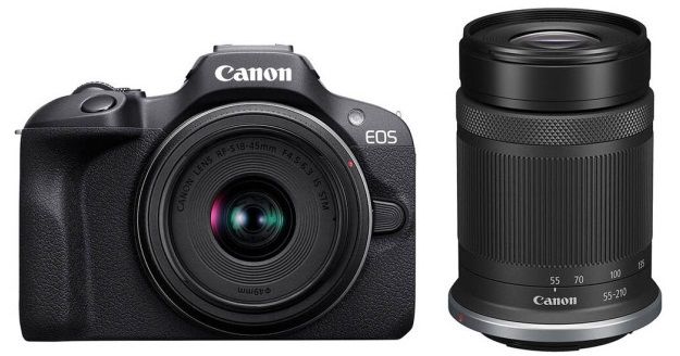 Canon EOS R100 — системна камера з байонетом Canon RF, оснащена сенсором APS-C CMOS 24,1 МП і процесором DIGIC 8. Модель підтримує відеозйомку у форматах 4K UHD та Full HD, має електронний видошукач OLED і ЖК-дисплей 3,0”. У комплекті два об’єктиви — RF-S 18–45mm F4.5–6.3 IS STM і RF-S 55–210mm F5–7.1 IS STM, що забезпечують універсальний діапазон фокусних відстаней/