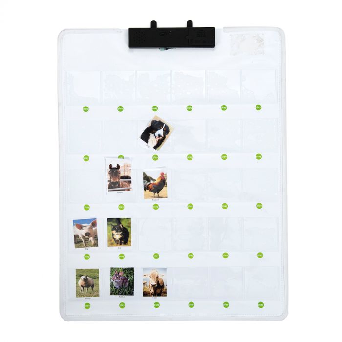 Вологозахиса настінна поверхня, яку можна використовувати в приміщенні або на вулиці. Помістіть картки, предмети або малюнки в 30 кишень і запишіть 30-секундне повідомлення для кожної з них.