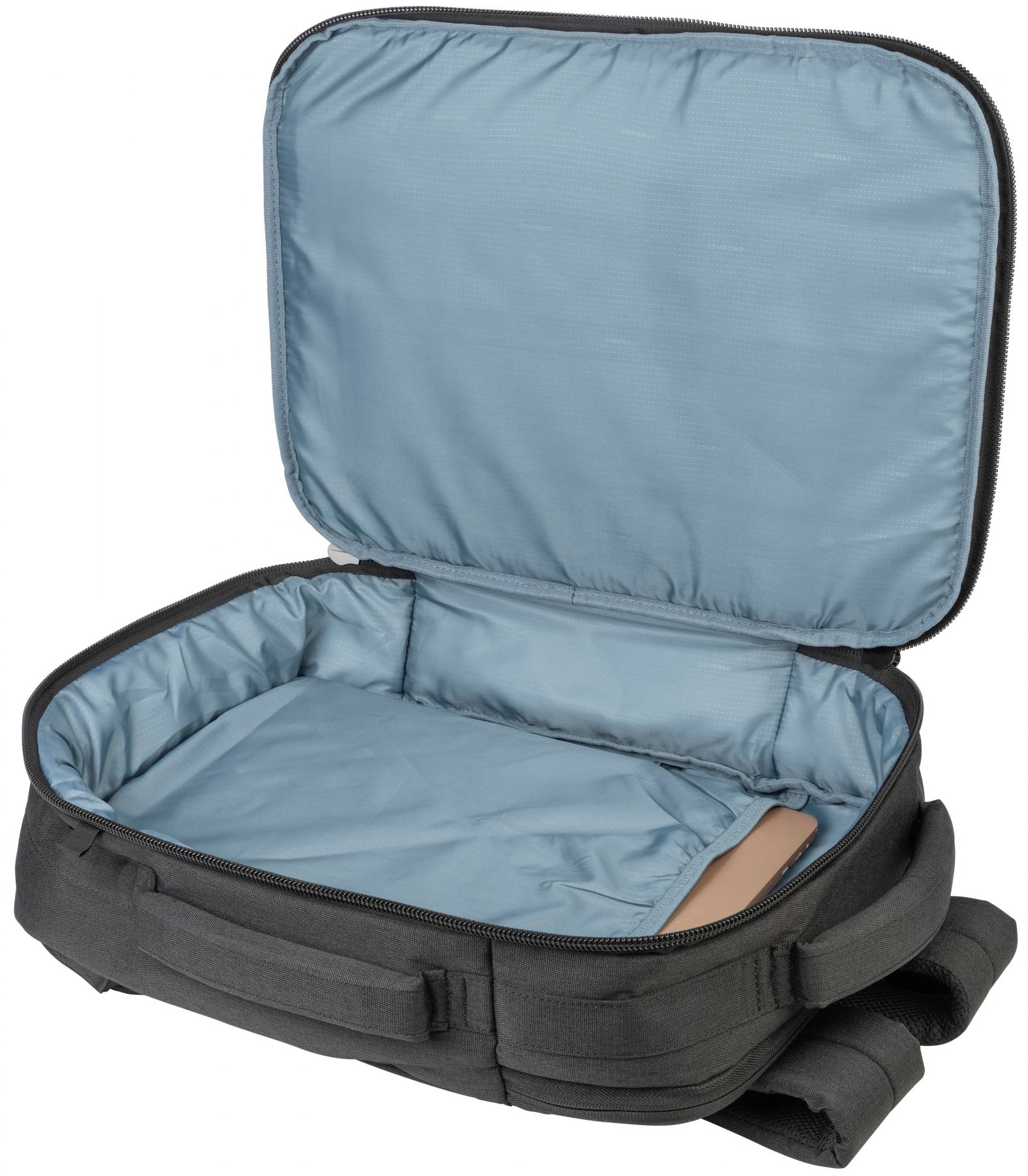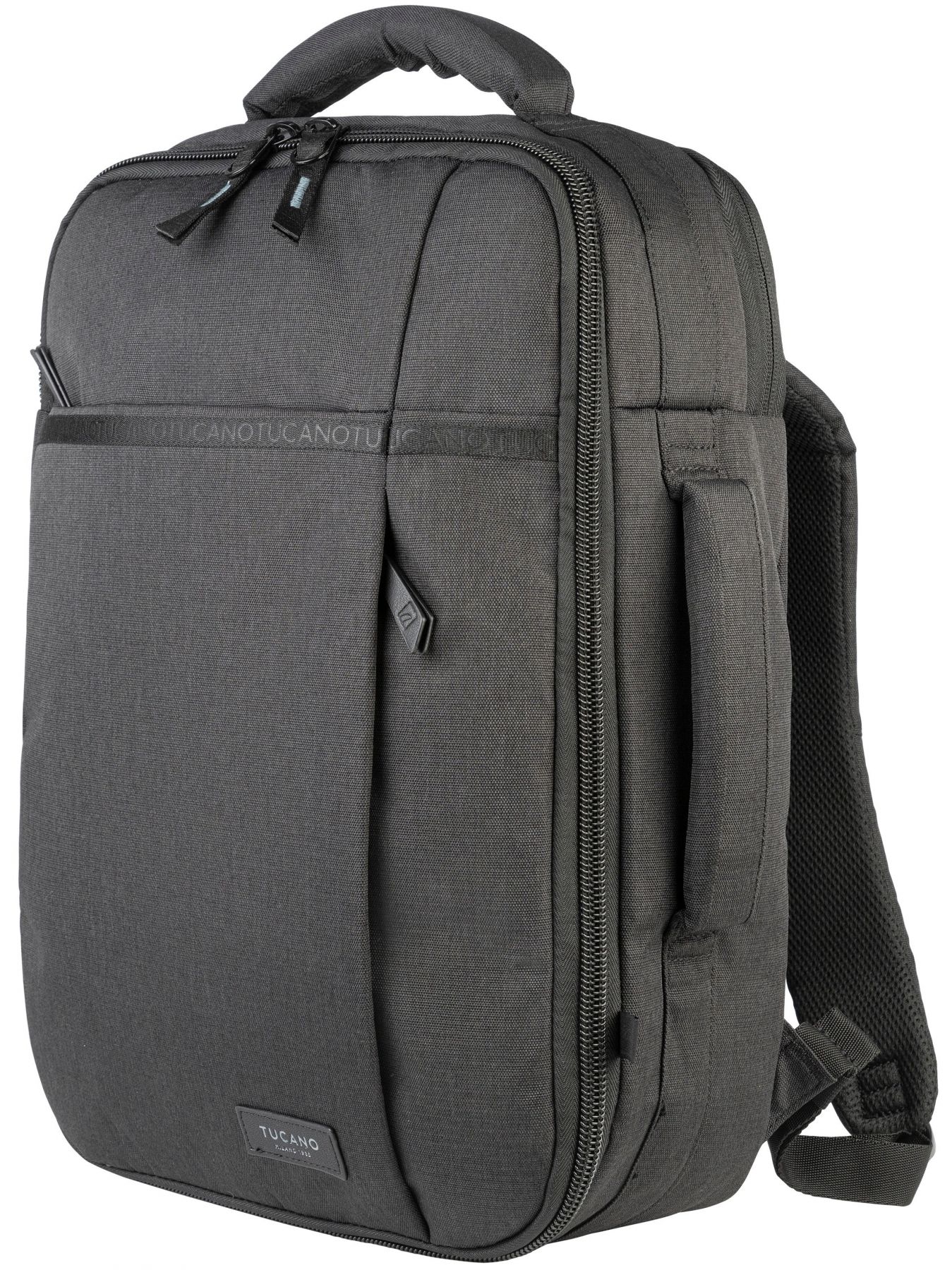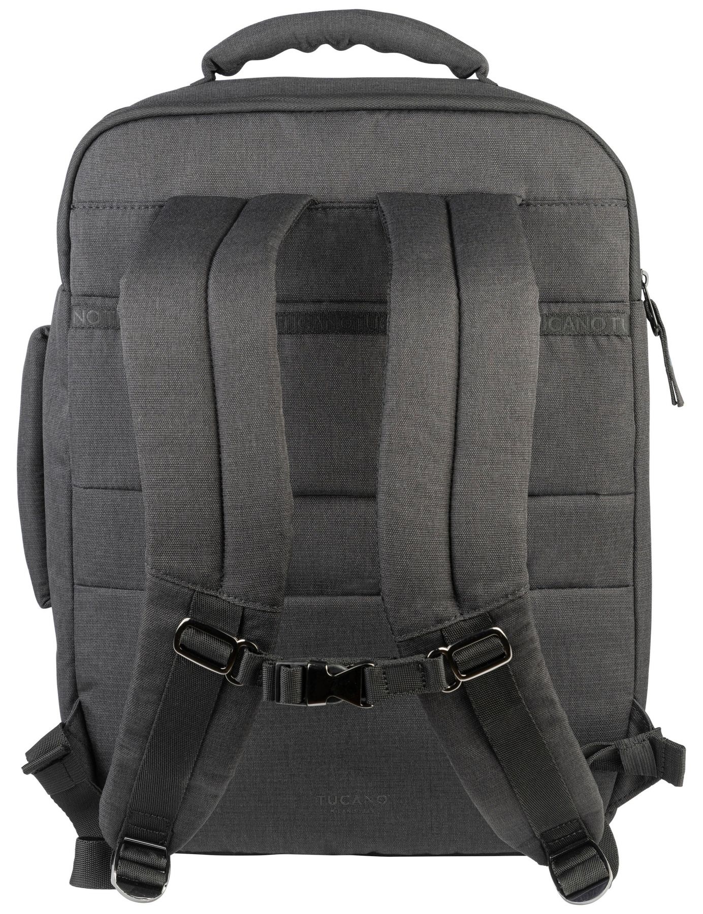 Дорожній рюкзак Tucano Ago 15 з меланжевої тканини з переробленого пластику. Основне відділення (речове) дуже містке і зручне, як міні-чемодан, відкривається на 270 градусів. В спинку рюкзака вбудовано спеціальне відділення для ноутбуків з діагоналлю 15,6-16 дюймів або 16-дюймових MacBook Pro. На фронтальній стороні розташовані дві місткі і зручні кишені на блискавках для аксесуарів і корисних дрібниць. З тильного боку - кишеня (антизлодій) і ремінець для кріплення на телескопічну ручку валізи. Плечові ремені з м'якою підкладкою і нагрудним фіксатором.