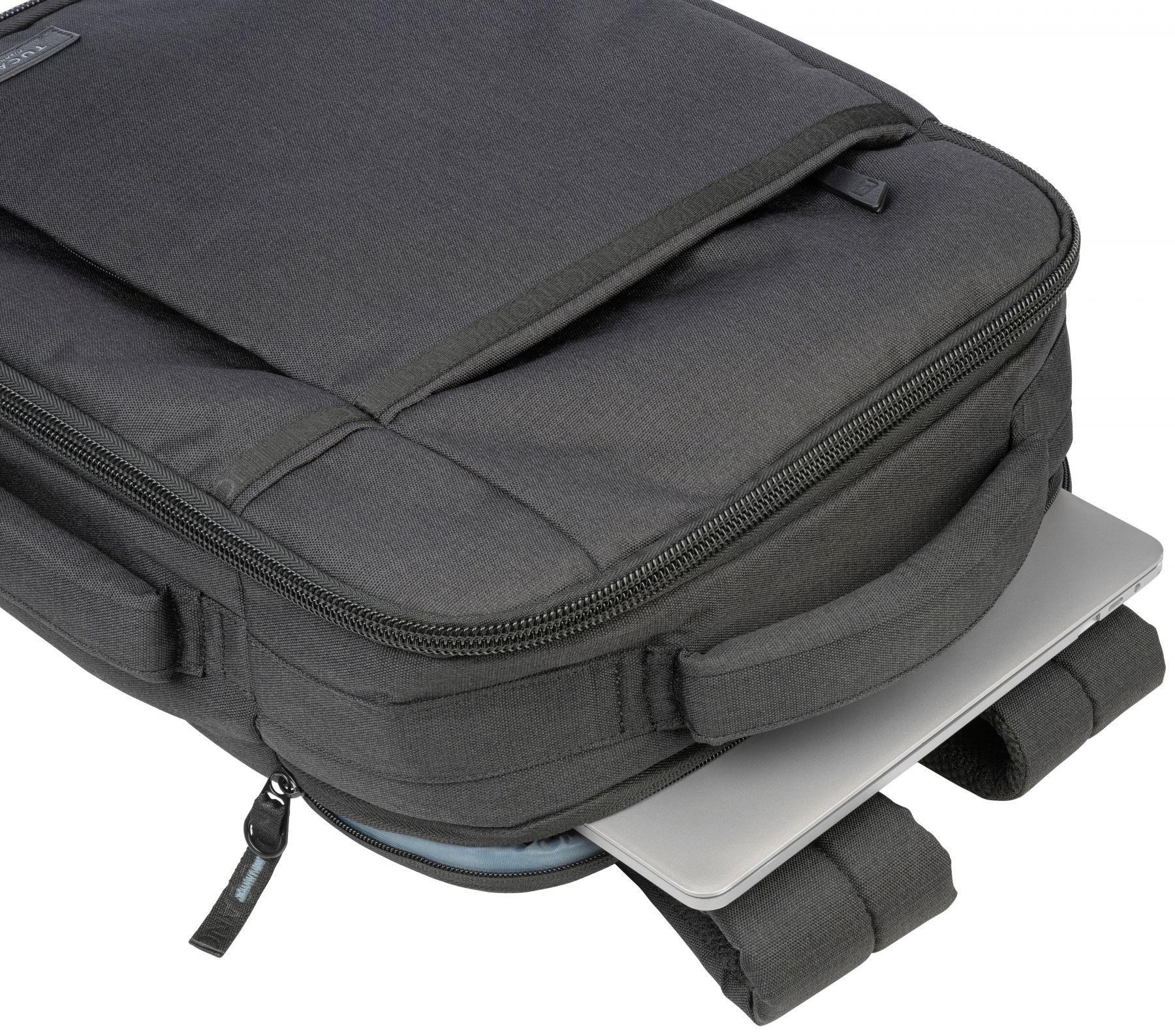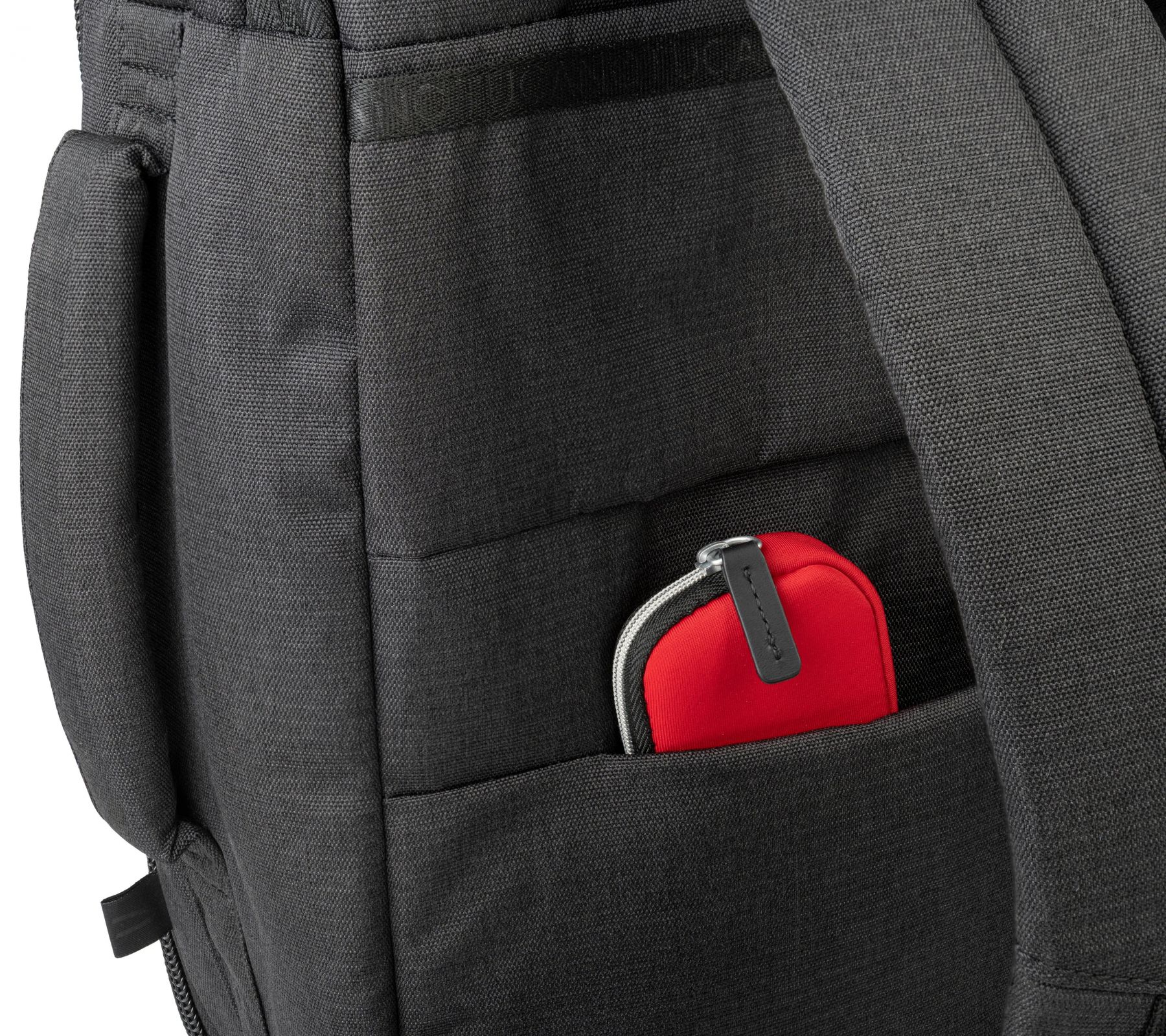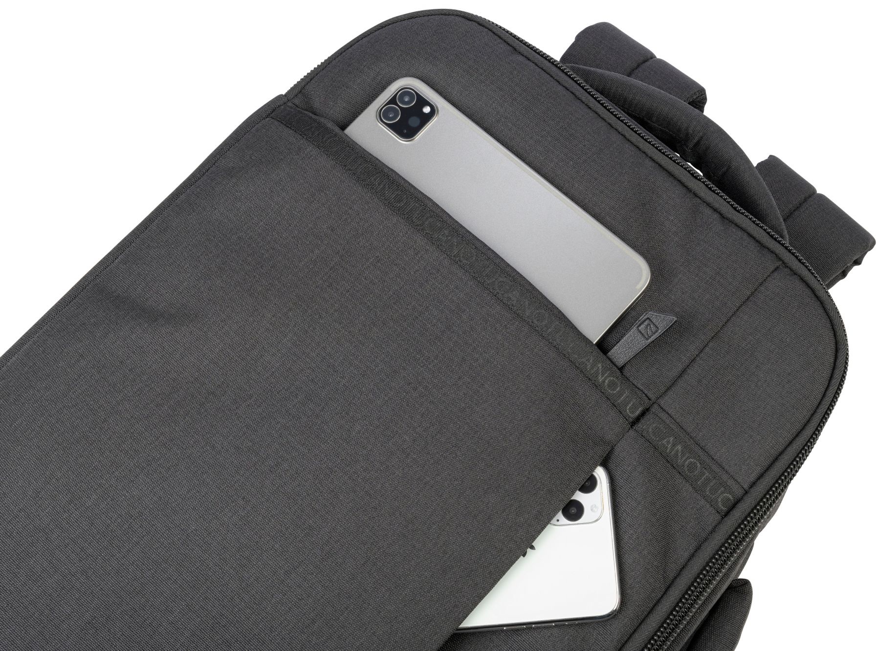 Дорожній рюкзак Tucano Ago 15 з меланжевої тканини з переробленого пластику. Основне відділення (речове) дуже містке і зручне, як міні-чемодан, відкривається на 270 градусів. В спинку рюкзака вбудовано спеціальне відділення для ноутбуків з діагоналлю 15,6-16 дюймів або 16-дюймових MacBook Pro. На фронтальній стороні розташовані дві місткі і зручні кишені на блискавках для аксесуарів і корисних дрібниць. З тильного боку - кишеня (антизлодій) і ремінець для кріплення на телескопічну ручку валізи. Плечові ремені з м'якою підкладкою і нагрудним фіксатором.