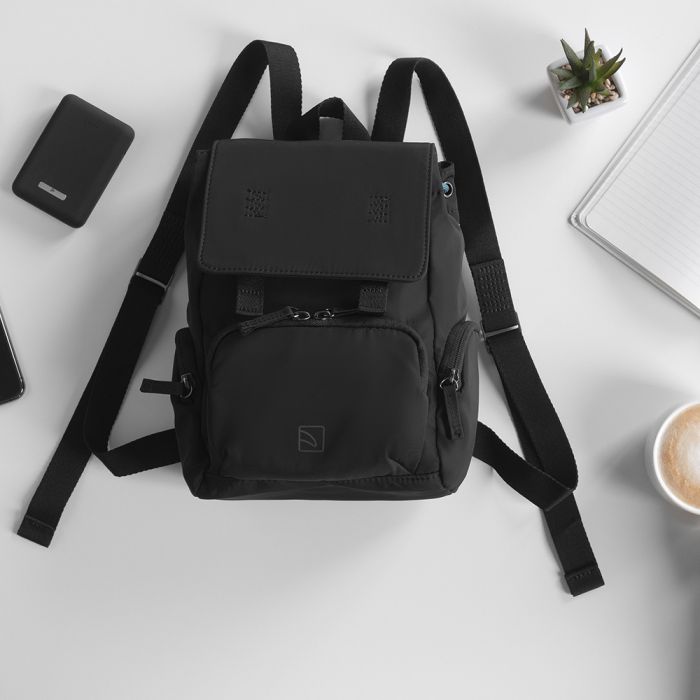 Невеликий легкий нейлоновий рюкзак з трьома місткими зовнішніми кишенями з лямками і ручкою. Підкладка і шнурок мають контрастний колір.