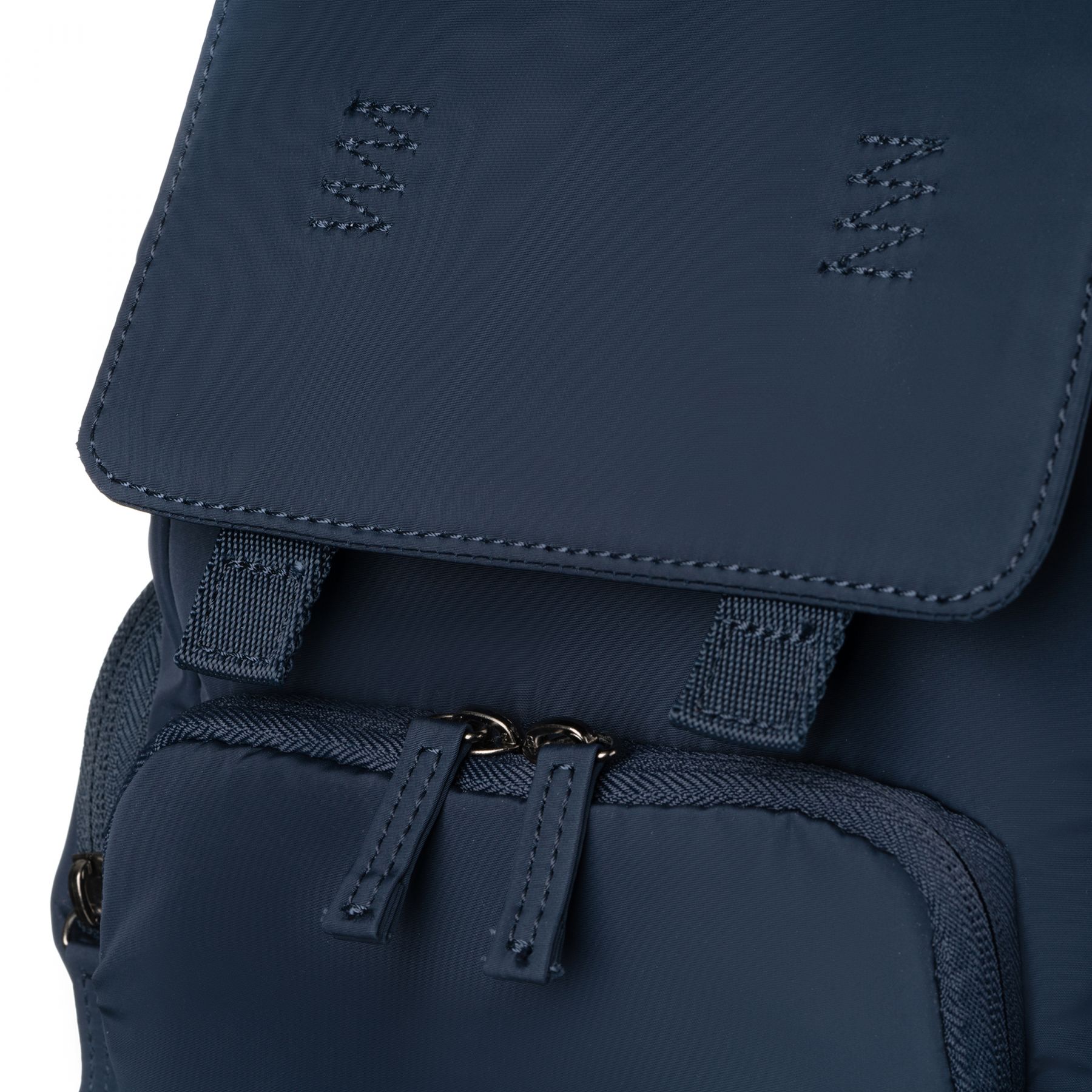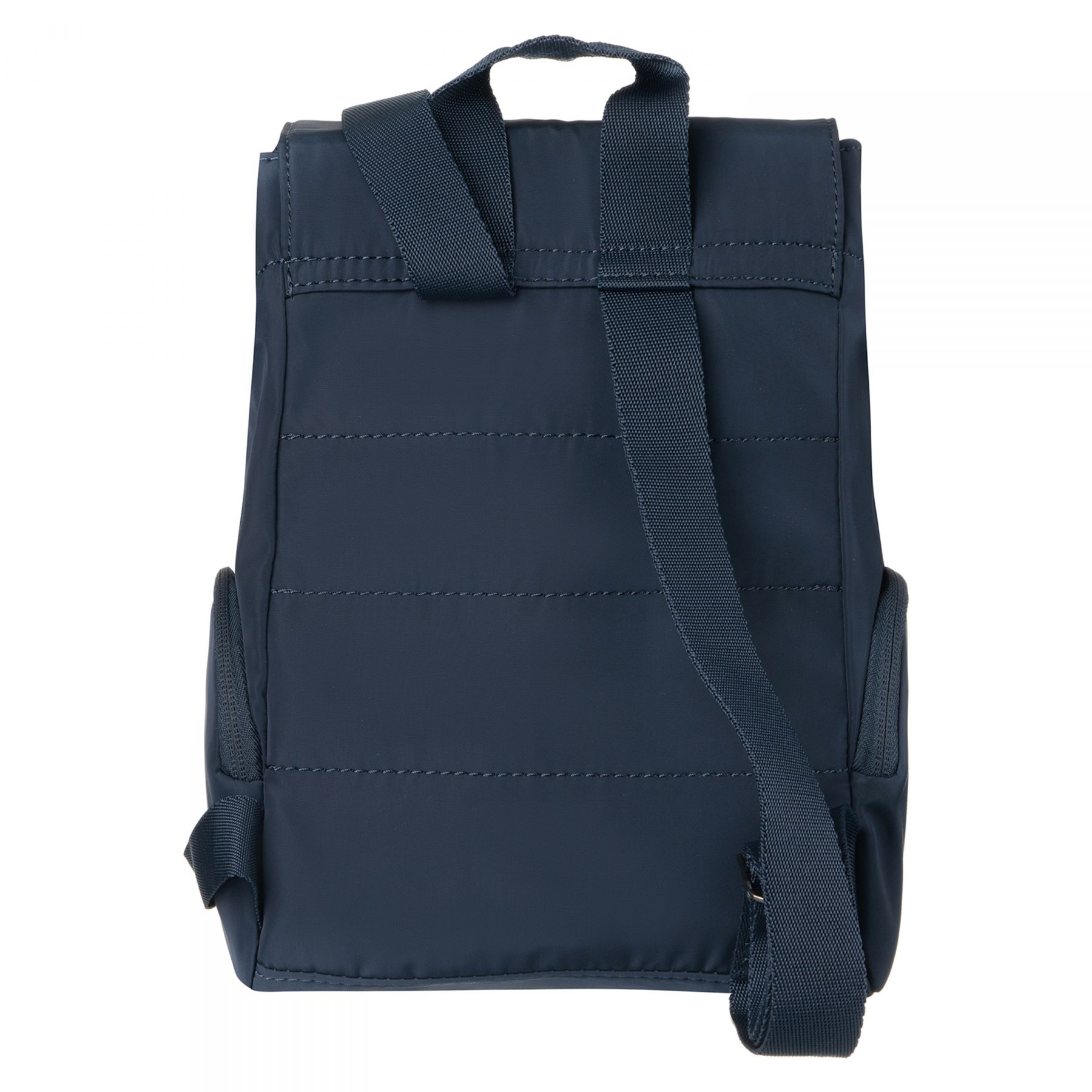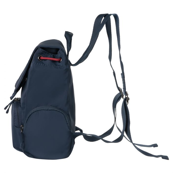 Невеликий легкий нейлоновий рюкзак з трьома місткими зовнішніми кишенями з лямками і ручкою. Підкладка і шнурок мають контрастний колір.