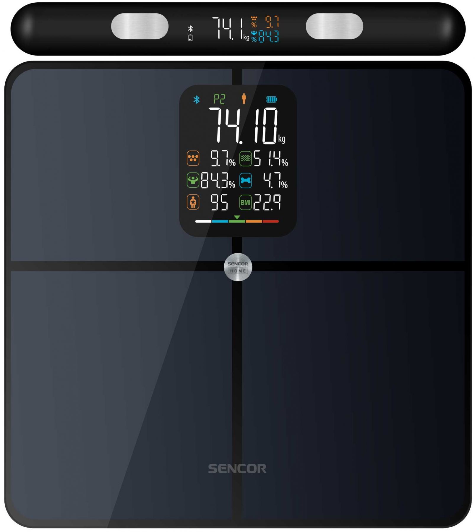 Підлогові розумні ваги Sencor з точним 5-сегментним аналізом тіла, Bluetooth-з'єднанням і підтримкою Sencor HOME. Показують ІМТ, жир, воду, м'язову й кісткову масу, дають поради щодо калорій. Сумісні з Apple Health, Google Fit, Fitbit. Загартоване скло, підсвічування дисплея, живлення 4×AAA.