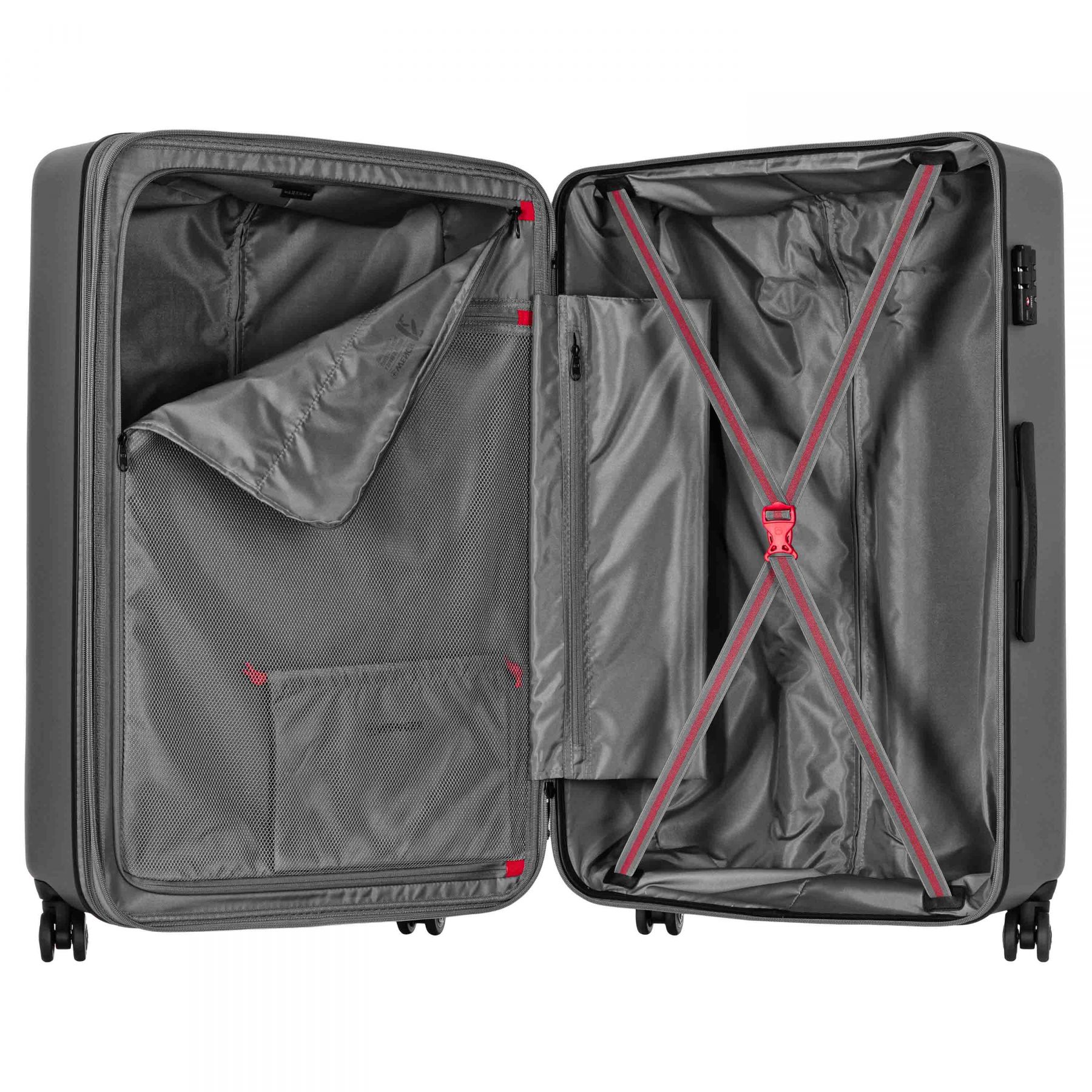 Особливості:сітчастий роздільник на блискавці з кишенею, можливість розширення (збільшення об'єму), вбудований кодовий замок Travel Sentry, чохол для взуття, компресійні ремені, подвійні колеса, подвійна блискавка