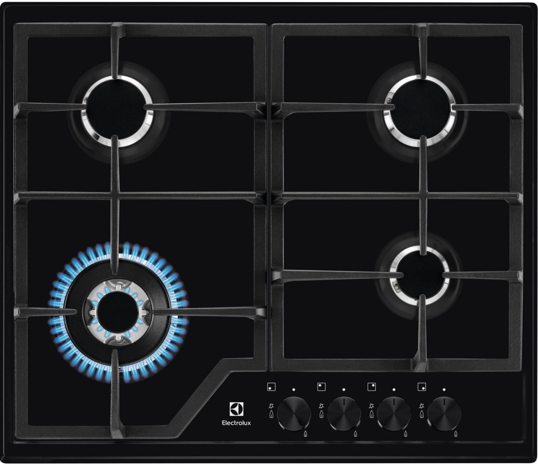 Electrolux KGS6436K — газова варильна поверхня 60 см у чорному кольорі з чавунними ґратками! 4 конфорки (до 4 кВт WOK), електричне підпалювання та газ-контроль — надійний помічник для кулінарії з безпекою та зручністю!