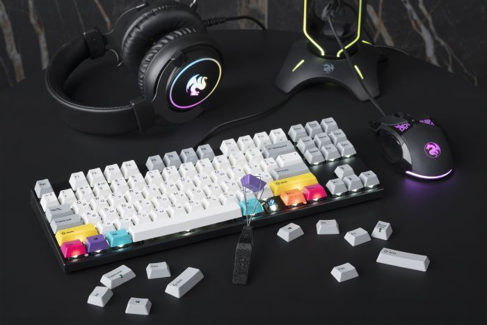 Компактна клавіатура Varmilo VA87M V2 CMYK має оригінальний дизайн. Ковпачки виготовлені з високоміцного пластика PBT із застосуванням dye-sublimation технології з вигравіруваними символами на боках, використання dye-sub дозволяє символам ніколи не стертися і ніяк не відчуватися при натисканні, а якісний PBT пластик гарантує надійність і довговічність, клавіші мають злегка текстурований верх і приємні на дотик.