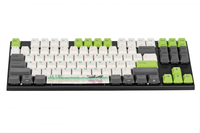 Компактна клавіатура Varmilo MA87M V2 Panda R2 має оригінальний дизайн в біло-зелених тонах і малюнки панди на деяких клавішах. Ковпачки виготовлені з високоміцного пластика PBT із застосуванням dye-sublimation технології з вигравіруваними символами на боках, використання dye-sub дозволяє символам ніколи не стертися і ніяк не відчуватися при натисканні, а якісний PBT пластик гарантує надійність і довговічність, клавіші мають злегка текстурований верх і приємні на дотик.