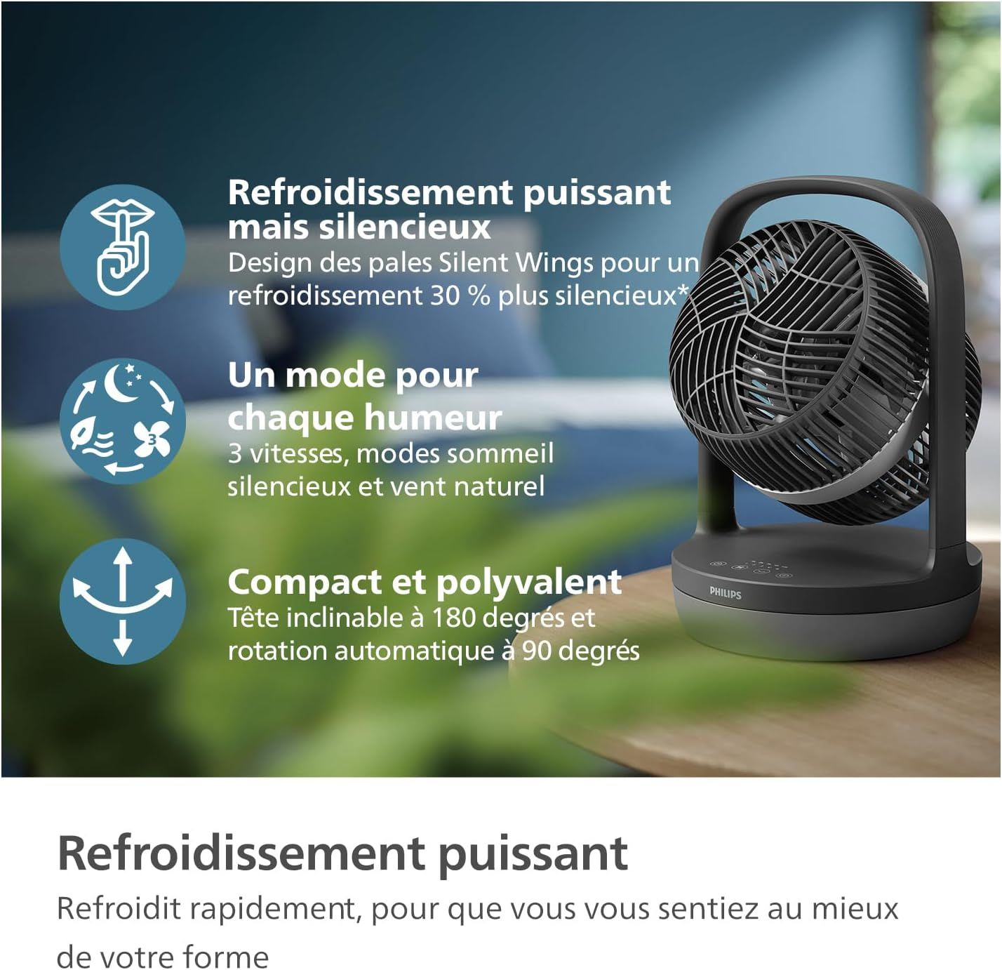Максимальне охолодження, мінімальний шум. Вентилятор розроблений так, щоб вписатися в будь-який інтер'єр і тихо охолоджувати ваш простір. Налаштуйте його відповідно до ваших потреб: 3 швидкості, 2 режими і таймера. Крім того, насолоджуйтеся покращеною циркуляцією повітря завдяки його нахиляючійся голівці.